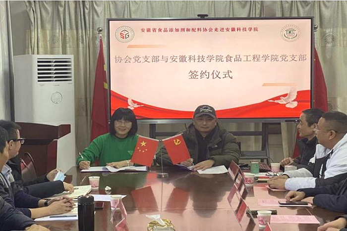 会上,学院副院长翟立公介绍了学院学科专业建设情况。安徽省食品添加剂和配料协会党支部分别与食品营养与安全系教工党支部和食品工程系教工党支部举行了结对共建签约仪式。企业代表结合各自招聘需求向参会学生发出了诚挚邀请。会后,协会理事长王从春一行在各科研团队负责人陪同下参观了学院实验室。