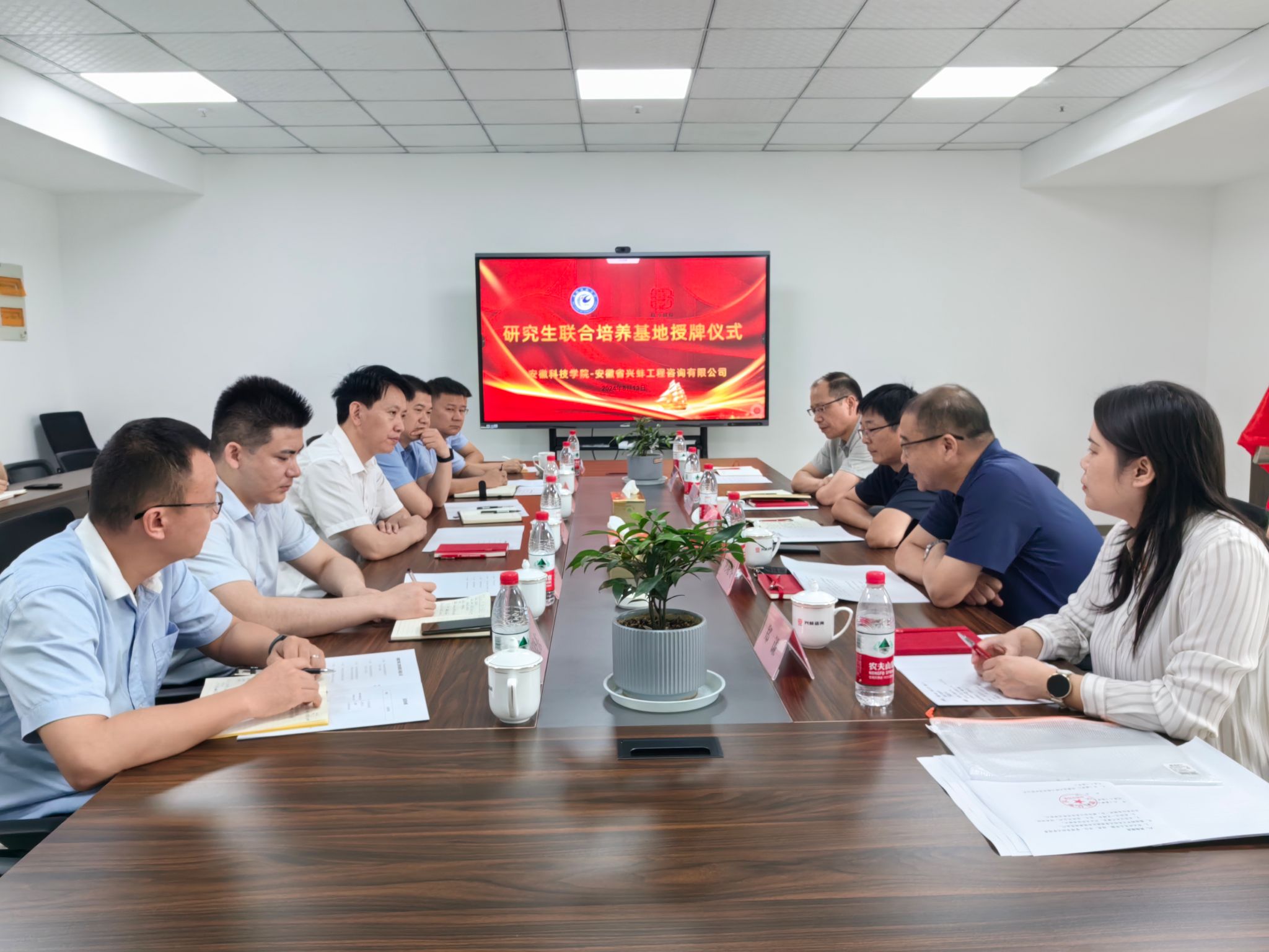 为进一步推动校企产学研用深度融合,推进研究生实习基地建设,8月13日上午,校研究生处处长张春雨,校招生与就业工作处副处长(主持工作)何晓冬,管理学院党委书记丁景良、副院长郑谦等一行5人赴安徽省兴蚌工程咨询有限公司签订校企产学研合作协议,共商研究生联合培养基地建设,受到蚌埠市城市投资控股集团党委书记、董事长沈明仕,公司党委委员、副总经理邓新东及该公司子公司兴蚌工程咨询有限公司领导等的热情接待。座谈签约仪式由丁景良主持。