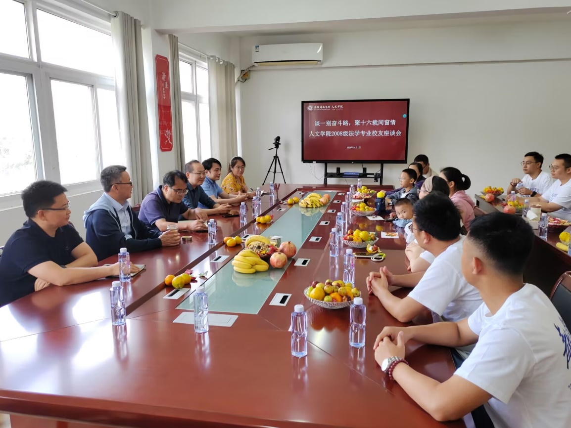 10月1日,丹桂飘香,举国欢庆,人文学院2008级法学专业的31位校友,身着“青春不散场”的统一服装,怀着对母校的深深眷恋和对青春岁月的美好回忆重返校园,在学知楼324会议室参加学院举办的温馨而富有意义的校友座谈会,学院党政领导、2008级法学专业两位班主任老师骆绪刚、宣刚及学院就业工作联系人焦雪松等出席。
