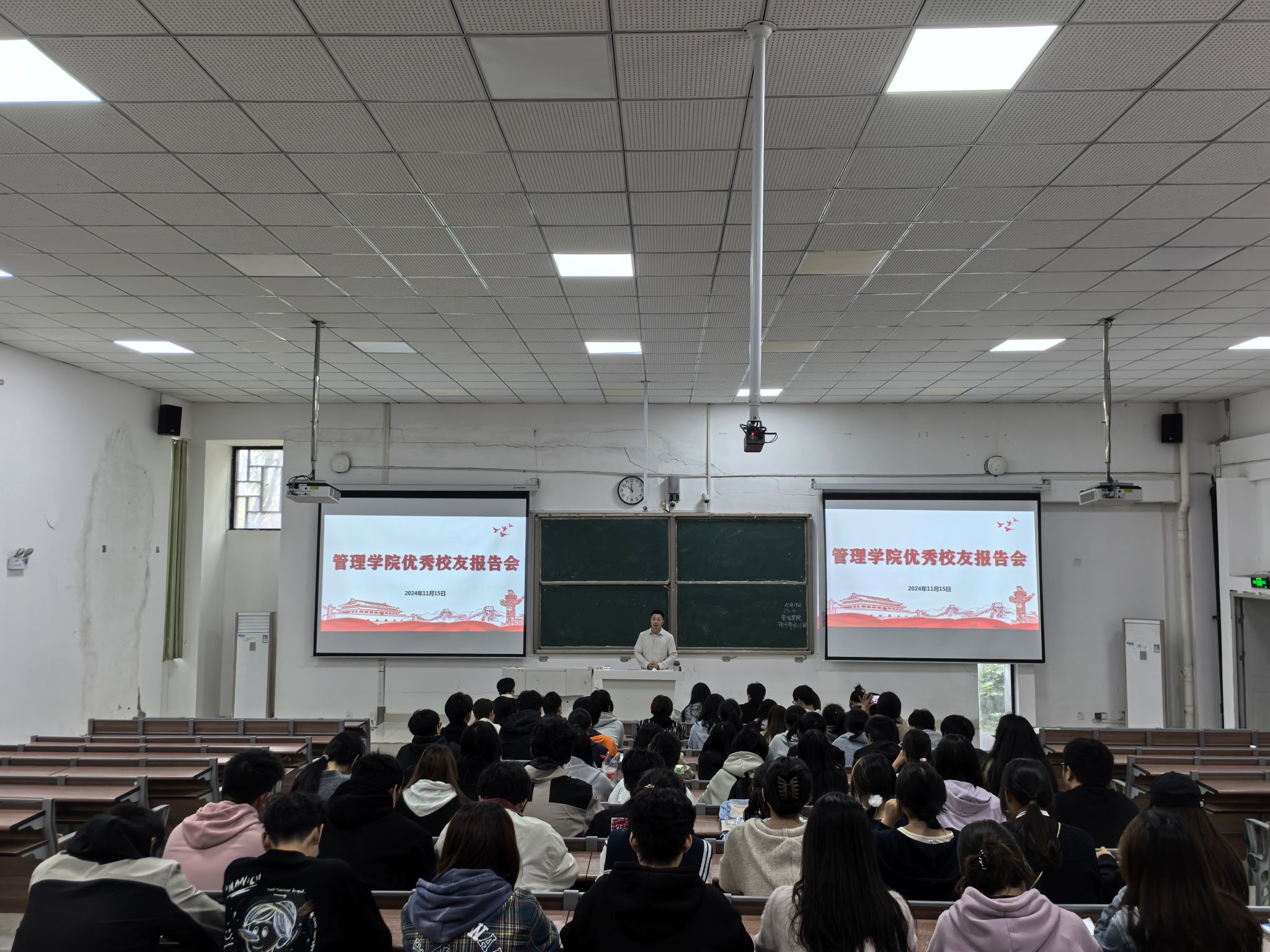 11月15日下午,管理学院在致知楼C111举办优秀校友报告会,我校2014届工商管理101班校友、纳思达股份有限公司董事长助理、广东松田科技股份有限公司董事会秘书、总经理助理王俊超应邀回母校作题为《从安科出发,青春逢盛世,奋斗正当时》的报告。管理学院党委副书记陶漫,全体专职辅导员和2024级新生班委、积极分子和党员代表百余人现场聆听报告会。