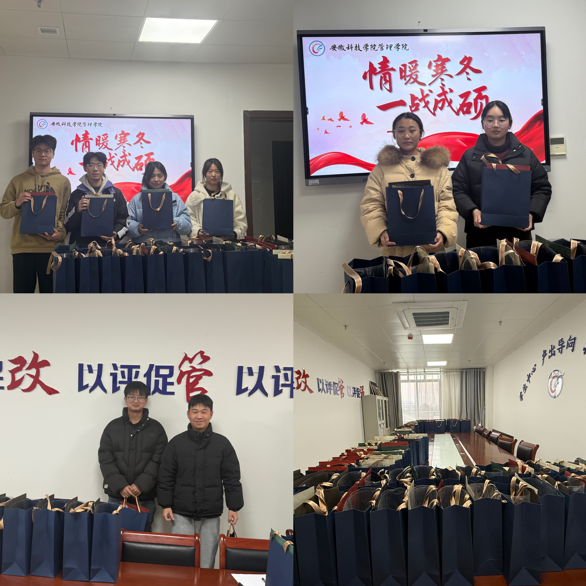 研途送暖,温情护航。在2025年全国硕士研究生招生考试即将来临之际,为鼓舞考研学子士气,增强备考信心。12月19日,管理学院为2025届考研学生举行了“情暖寒冬 一战成硕”送温暖活动,学院党委副书记陶漫和毕业班辅导员共同慰问2025届考研学子并发放“考研加油包”,助力梦想启航。