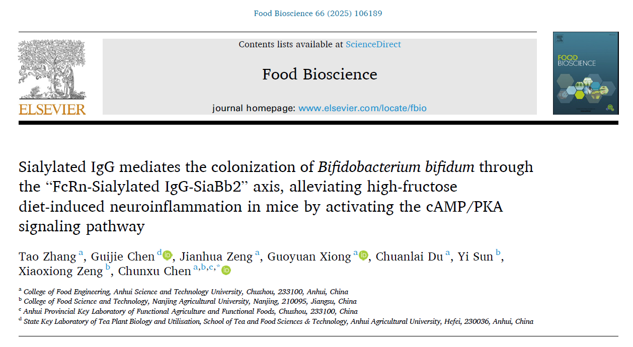 近日,食品科学与工程学院陈春旭副教授以通讯作者身份在国际Top期刊《Food Bioscience》(Q1,影响因子4.8)发表了题为“Sialylated IgG mediates the colonization ofBifidobacterium bifidumthrough the “FcRn-Sialylated IgG-SiaBb2” axis, alleviating high-fructose diet-induced neuroinflammation in mice by activating the cAMP/PKA signaling pathway”的研究论文,论文的第一作者为三亿网页版2023级食品加工与安全专业硕士研究生张涛,三亿网页版为第一完成单位,南京农业大学曾晓雄教授课题组为合作单位。