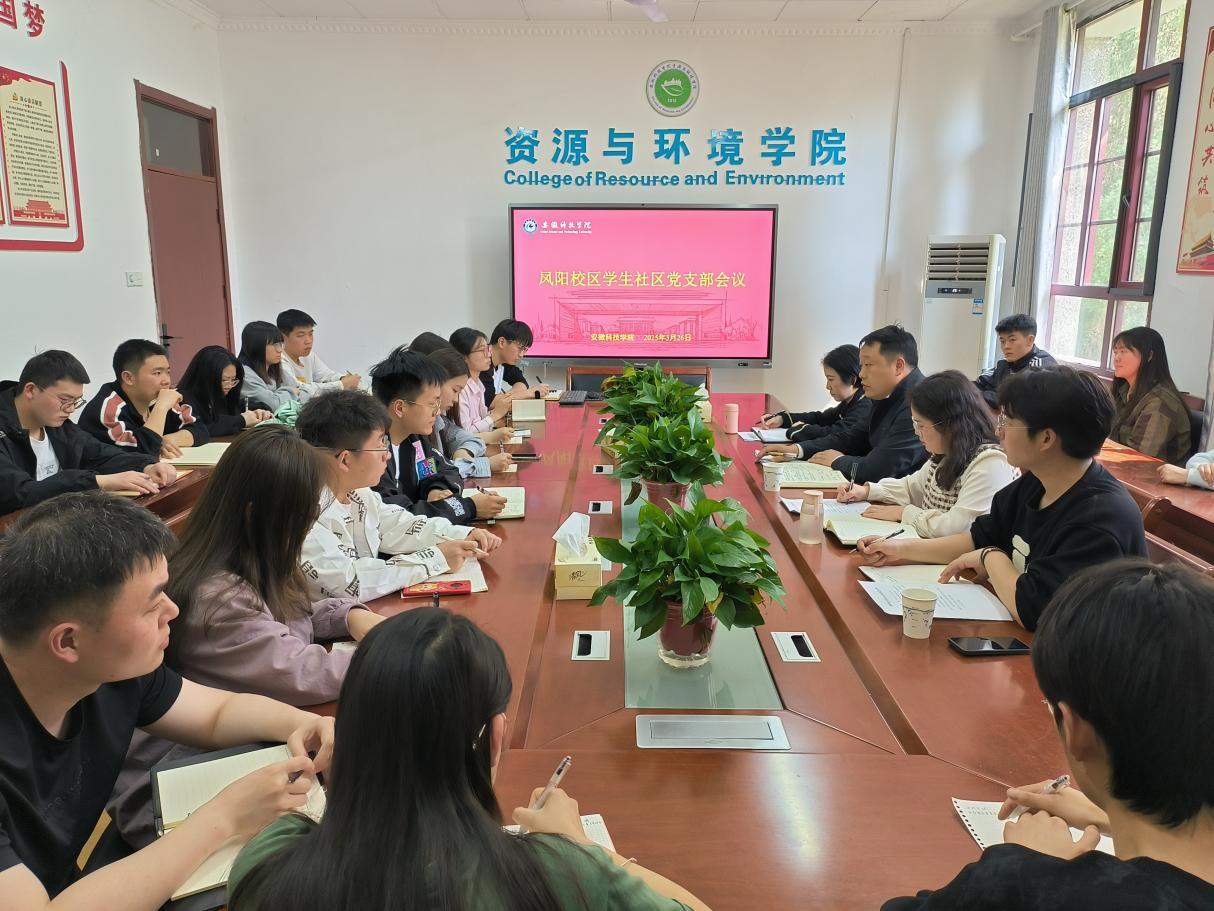 3月26日下午,凤阳校区学生社区党支部工作会议在资源与环境学院会议室召开。党委学工部副部长、学生处副处长陆双双,党委组织部组织科科长储德丹,学生社区党支部书记杨小晗、副书记张文龙及支部全体党员出席会议。会议由杨小晗主持。