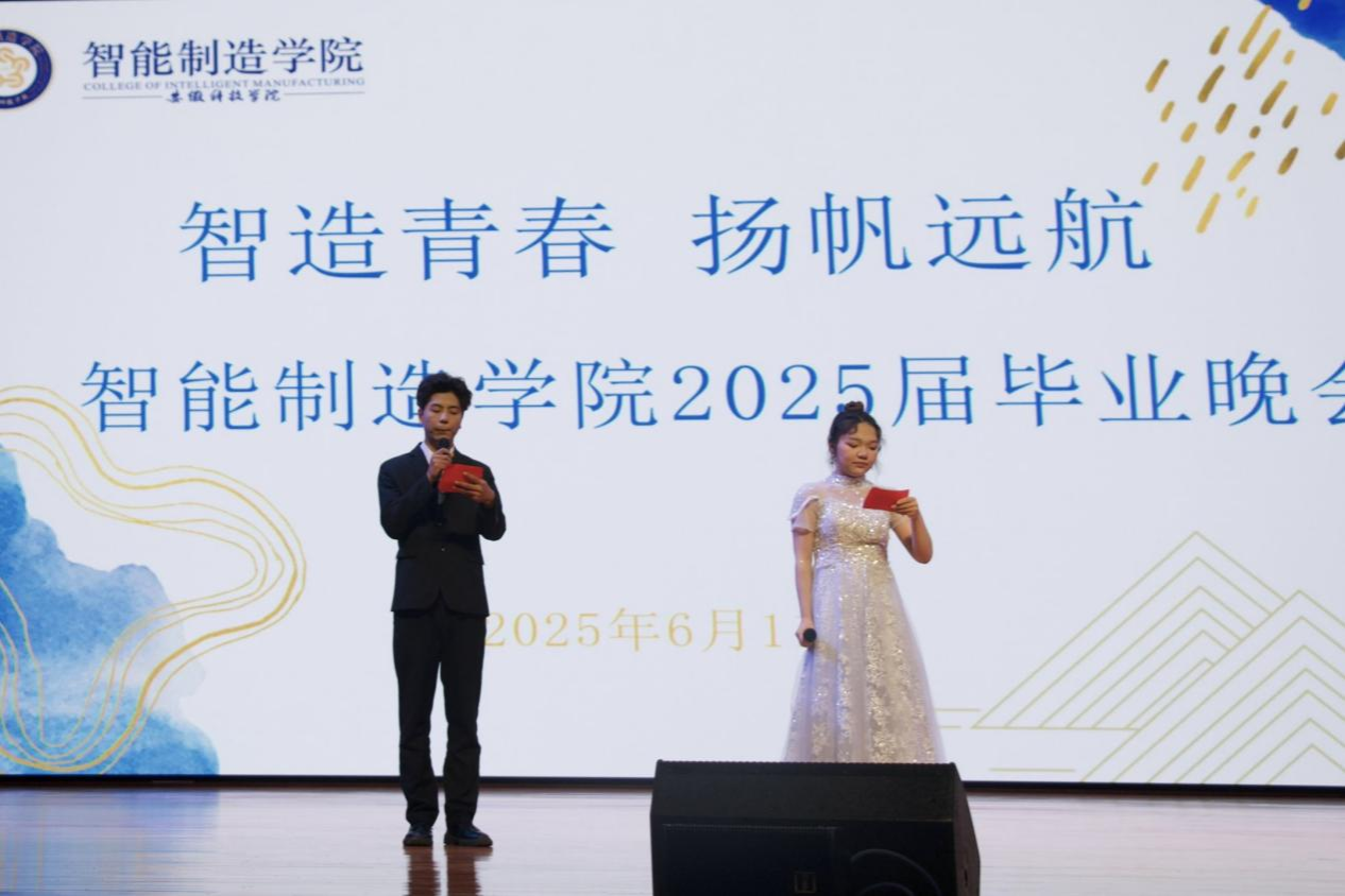 6月11日晚,智能制造学院在知行礼堂隆重举行了以“智造青春 扬帆远航”为主题的欢送2025届毕业生晚会。学院党政领导、全体毕业班辅导员、部分专业课教师、2025届毕业生及部分非毕业班学生参加晚会。