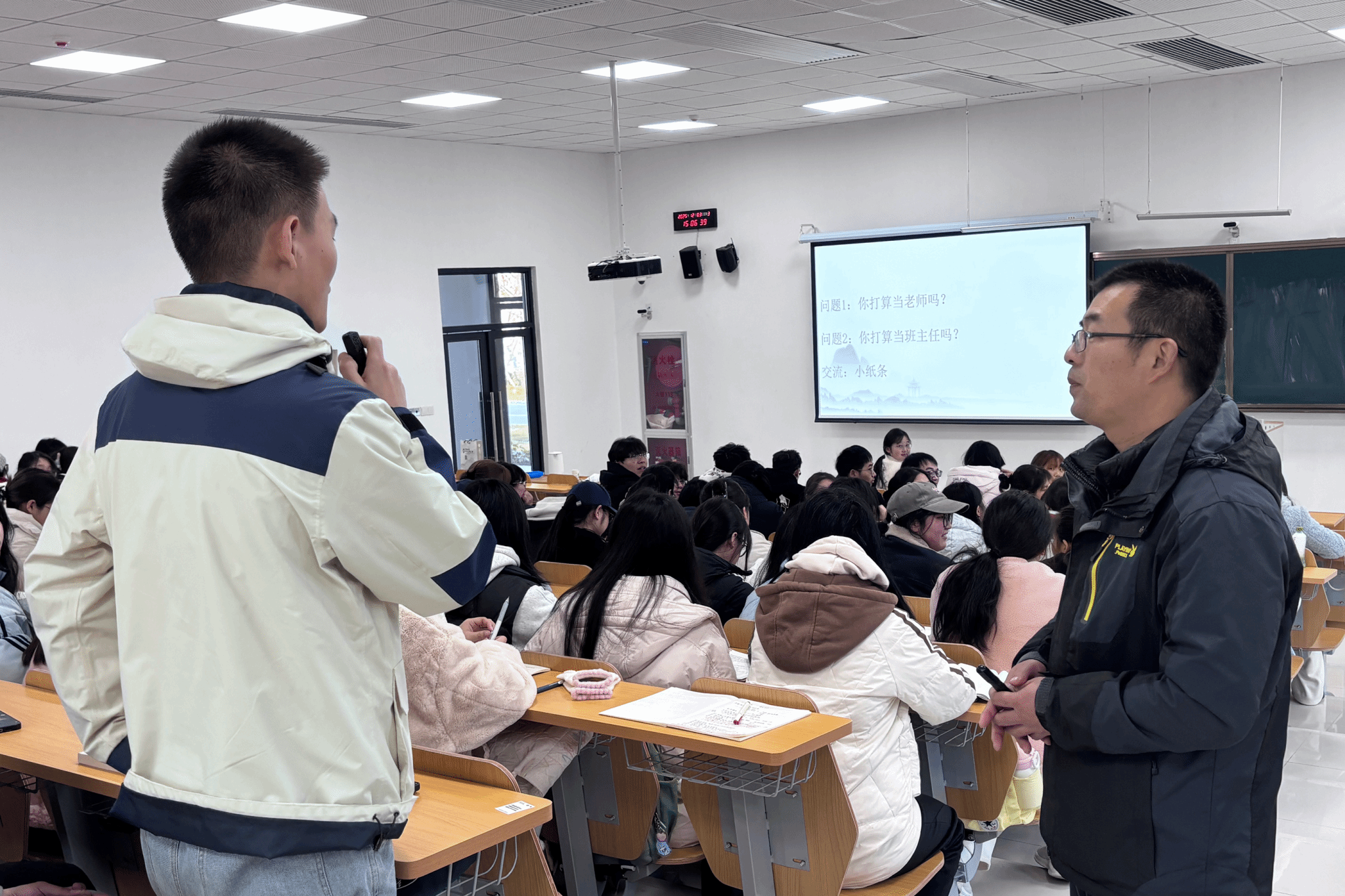 程勇文以一段真实的班级生活视频开启讲座,通过“你想成为一名教师吗?”的现场互动,引发学生深度思考。他伴着背景音乐现场朗诵艾青的《我爱这土地》,以此为引点明“热爱是班主任事业的灵魂底色”。他围绕班级建设、德育实施、心理关怀、团队协作等关键方面,结合多个真实生动的教育实例,剖析班主任在日常工作中运用的策略与方法。程勇文强调,教育不止于方法技巧,更在于情感的投入与价值的传递。教师的专业素养体现在对日常事务的妥善处理中,更在于持续的正向引导与情感付出。这是构建师生信任、实现教学相长这一双向滋养过程的关键所在。
