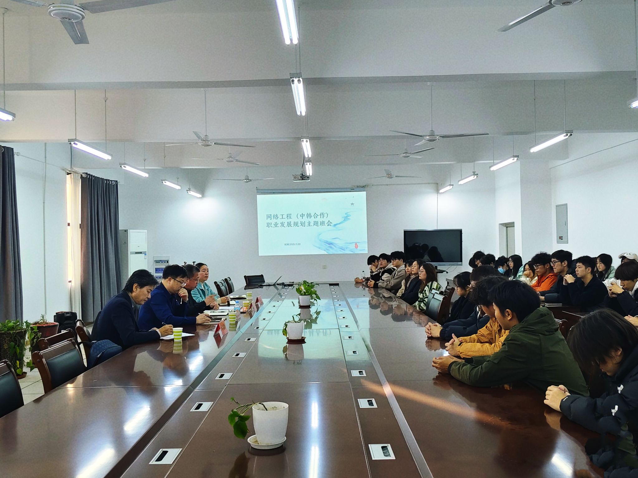 11月30日下午,信息与网络工程学院2024级网络工程(中韩合作)专业开展了“职业生涯规划”主题班会。班会特邀网络工程(中韩合作)241班联系领导教务处(主持工作)舒英杰与同学们面对面交流,倾听学子心声,指引成长方向。国际交流与合作处处长何世潮、信息与网络工程学院党委副书记韦乃学应邀出席。