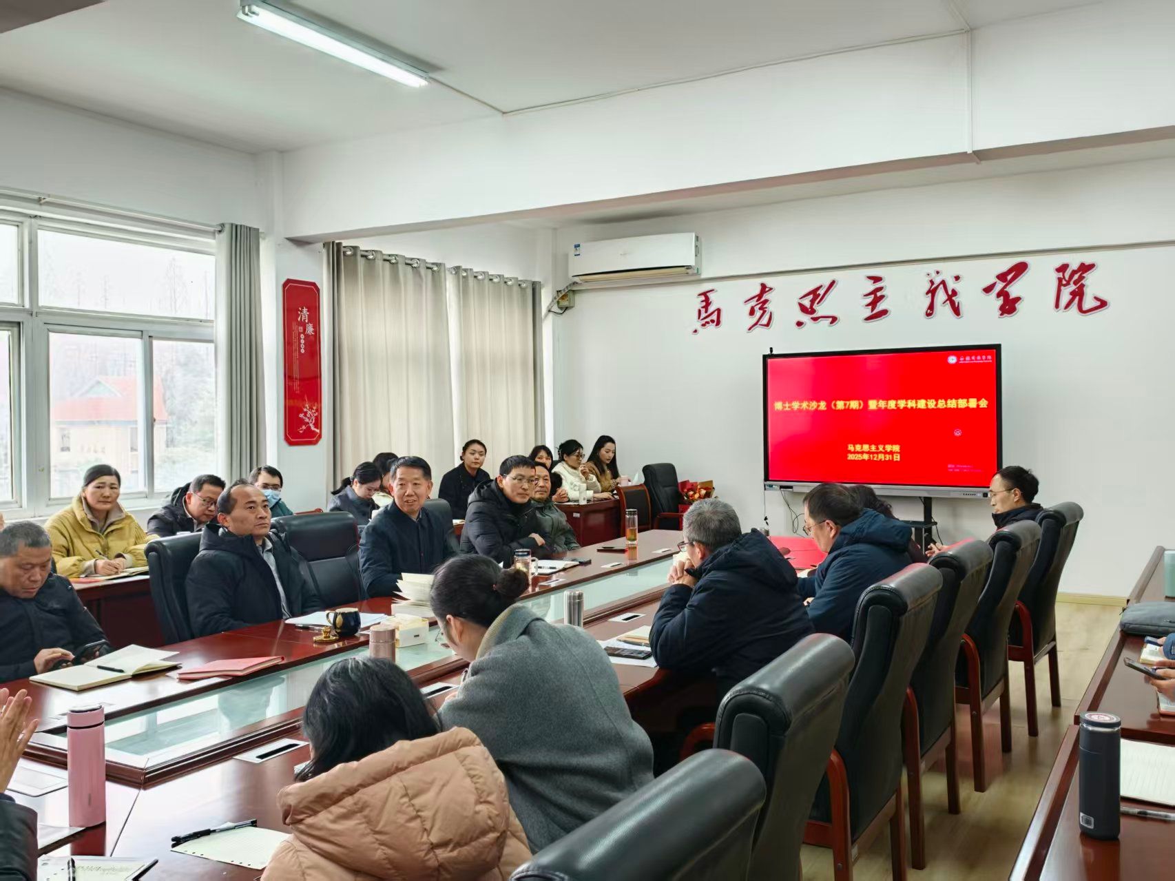 12月31日下午,马克思主义学院在学知楼326会议室召开博士学术沙龙暨年度学科建设总结布置会,全体师生参会。会议由院长张德化主持。