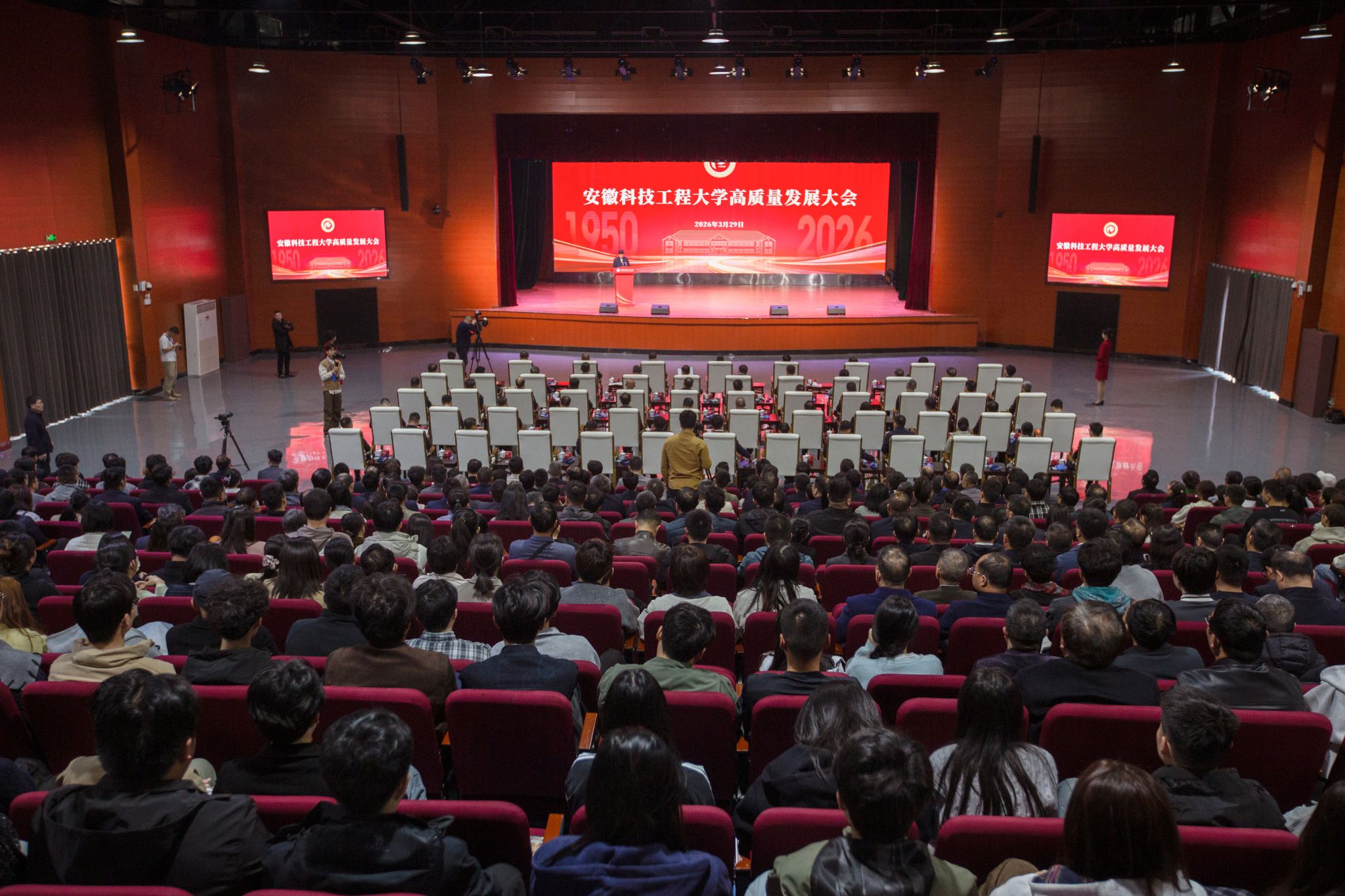 在热烈的掌声中,与会领导嘉宾共同为新校名揭牌。现场掌声雷动,经久不息,全体师生共同见证了这一载入学校史册的重要时刻,开启了安徽科技工程大学发展新纪元。