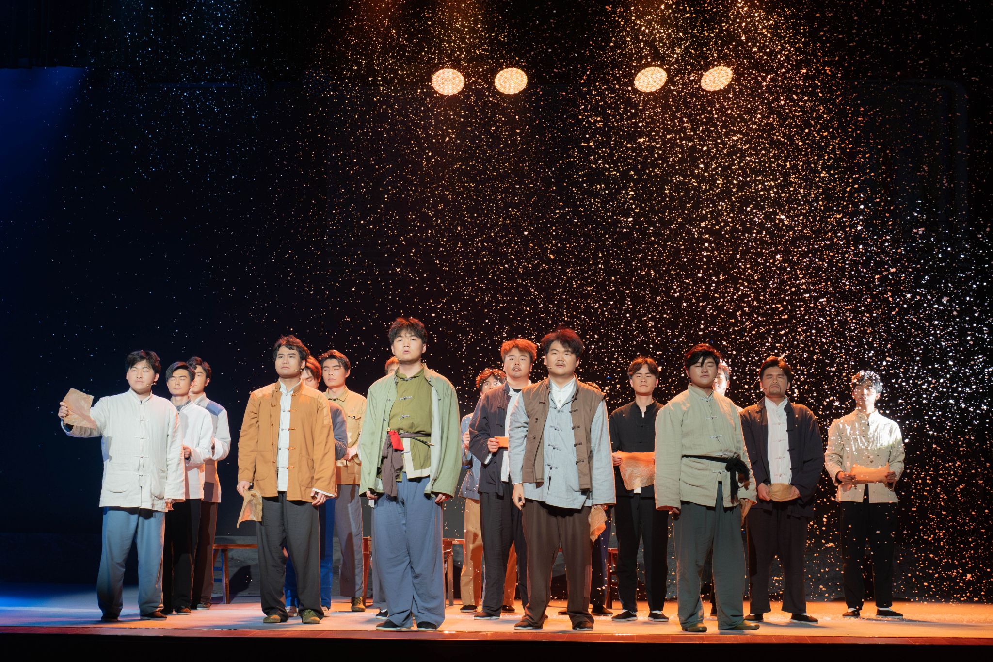 在创作与呈现上学校坚持高标准、高品质,历时三年组建思政、艺术、乡村研究、农学专业的跨领域主创团队,邀请专业导演团队全程指导,聘请国家级非遗传承人融入凤阳花鼓等地方文化元素,融合实景演绎、冰屏特效等多种舞台手段,打破传统思政课堂单向灌输模式。跌宕起伏的剧情、鲜活立体的人物、沉浸式的舞台体验,让抽象的精神理念化作具象的舞台故事,既让红色文化与地方文化相得益彰,更让话剧成为兼具艺术美感与思想深度的精品力作。