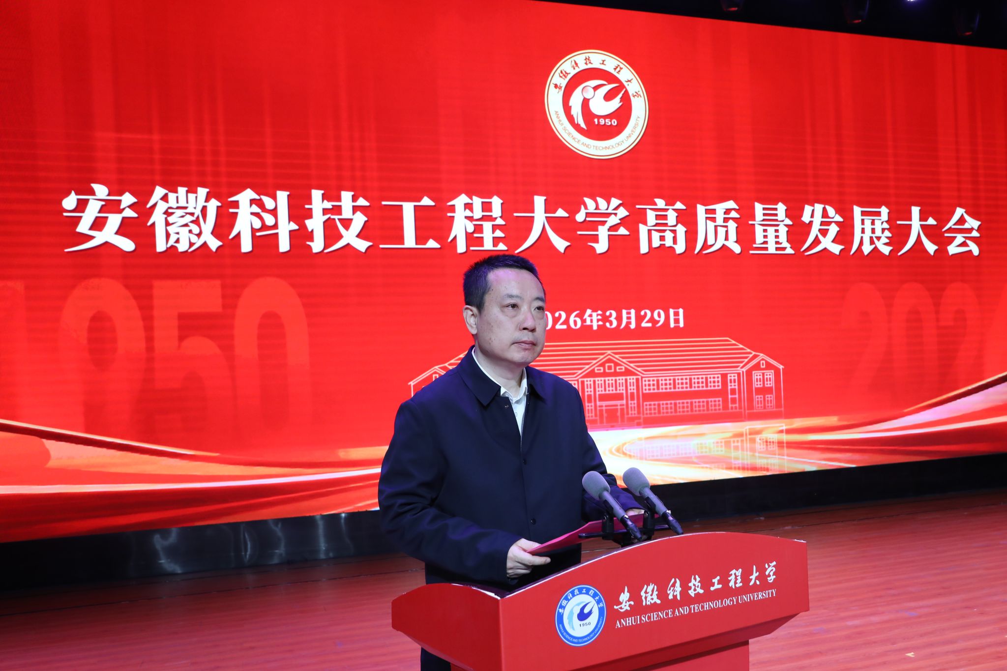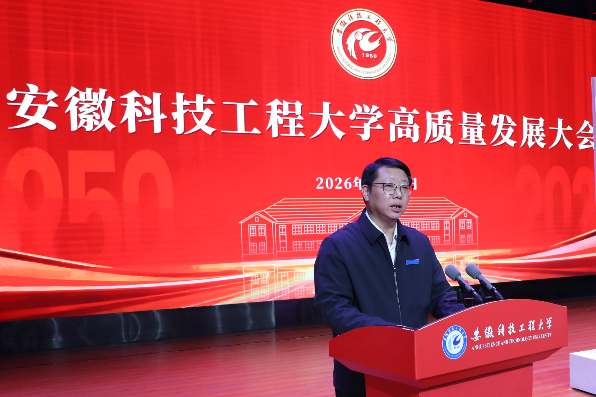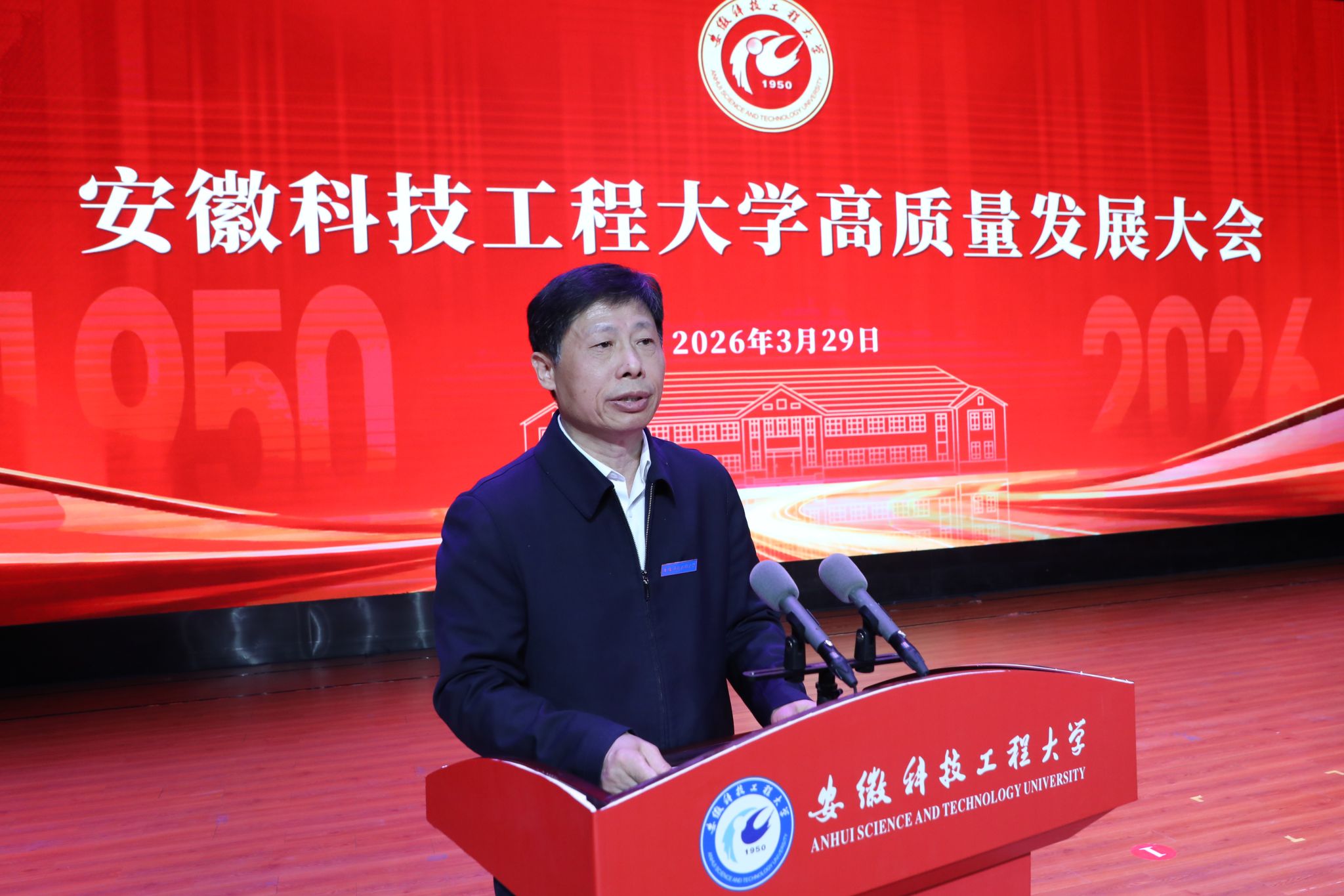 校友代表、清华大学基础医学院研究员、博士生导师闫利明向母校致以最热烈的祝贺,深情回忆了在母校求学时的点滴,感念师长们的谆谆教诲与同窗间的深厚情谊,并号召广大校友一如既往关心支持母校发展,在新起点上同心同行,共同书写安徽科技工程大学更加辉煌的明天。