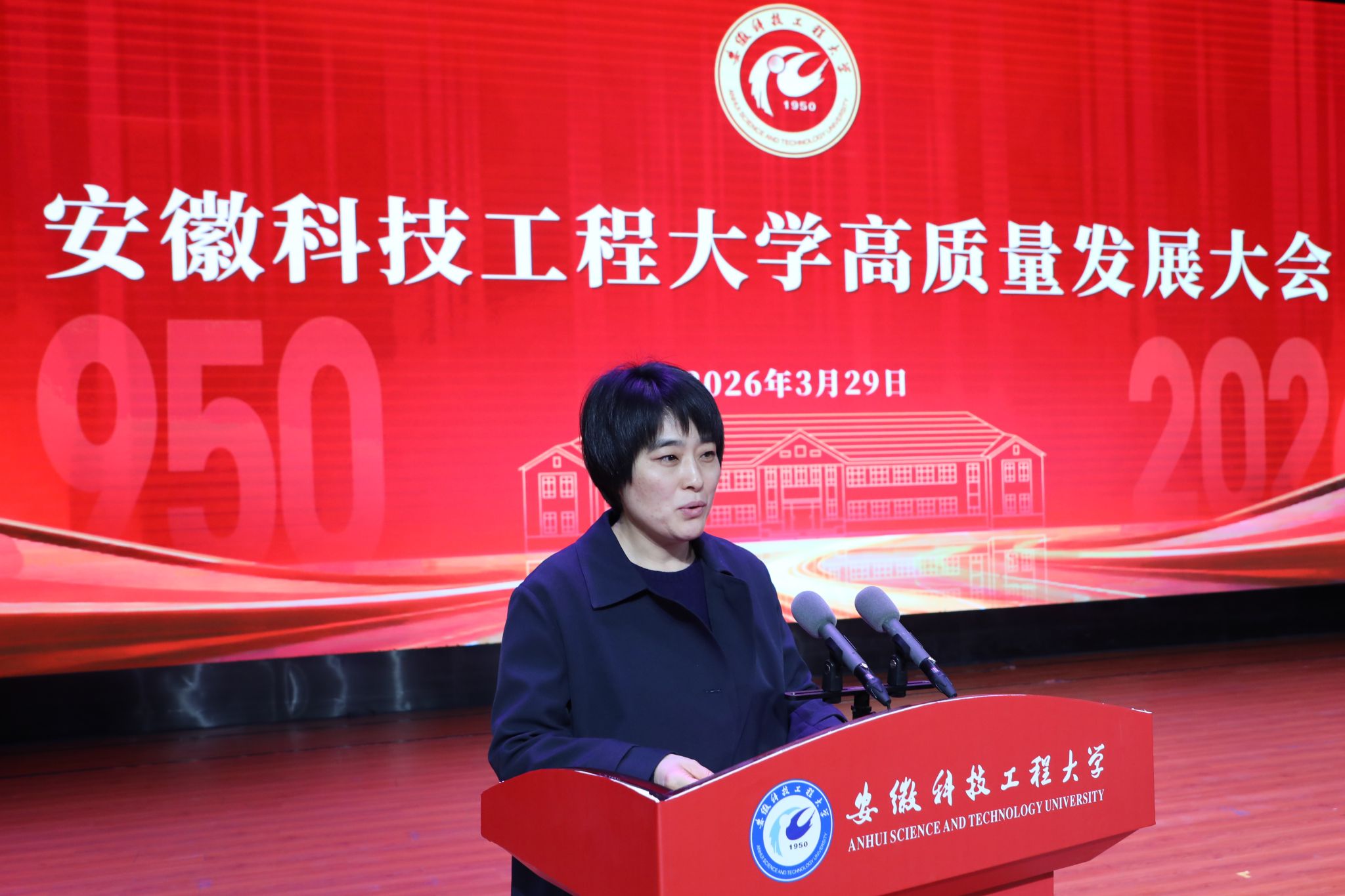 蚌埠市委副书记、市长韦秀芳在致辞中代表蚌埠市委、市政府向安徽科技工程大学全体师生员工致以热烈祝贺。她指出,安徽科技工程大学办学历史悠久、底蕴深厚,长期以来与蚌埠市保持着紧密的合作关系,为蚌埠经济社会发展提供了强有力的人才支撑和智力支持。她表示,蚌埠市将一如既往地全力支持学校建设与发展,持续深化校地融合,在科技创新、平台建设、人才引进等方面提供更优的服务和保障,携手谱写校地合作共赢的新篇章。