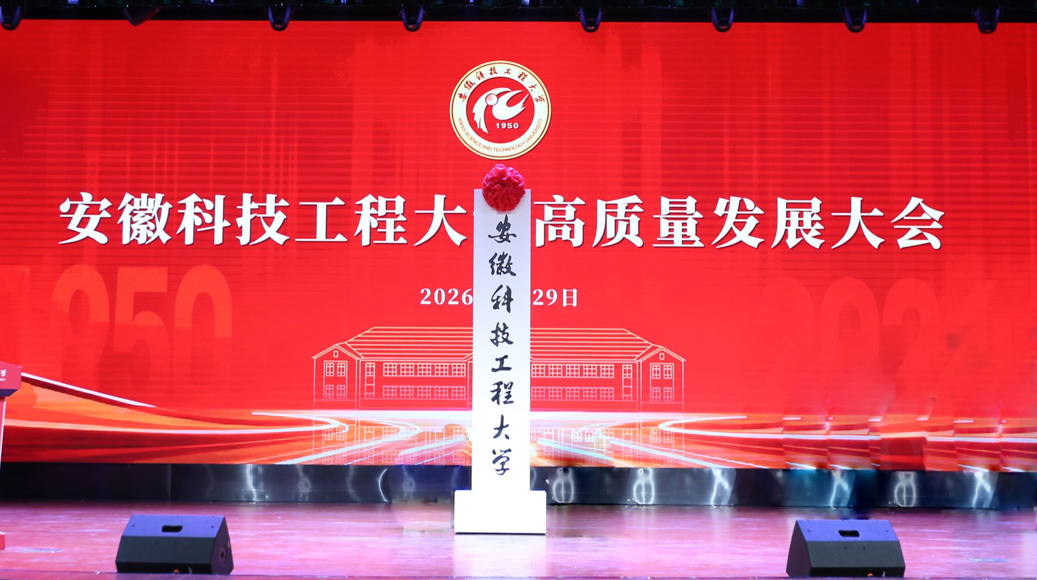 在热烈的掌声中,与会领导嘉宾共同为新校名揭牌。现场掌声雷动,经久不息,全体师生共同见证了这一载入学校史册的重要时刻,开启了安徽科技工程大学发展新纪元。