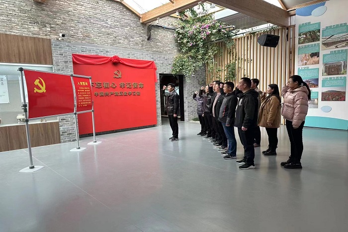 参观现场,全体党员面向鲜红党旗,重温入党誓词。