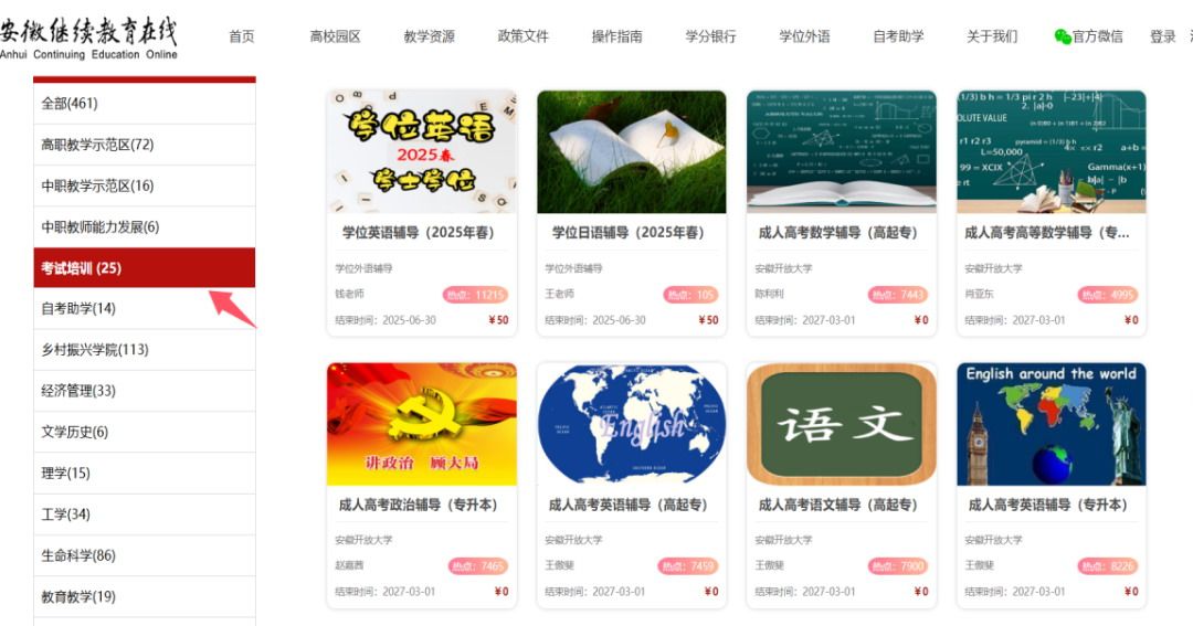 平台首页下拉滚动条进入平台的“课程超市”模块,选择“考试培训”,即可选择相关课程参与学习。
