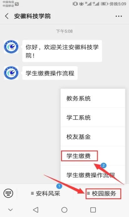1.点击“三亿网页版微信公众号”界面右下角“学生缴费”菜单。
