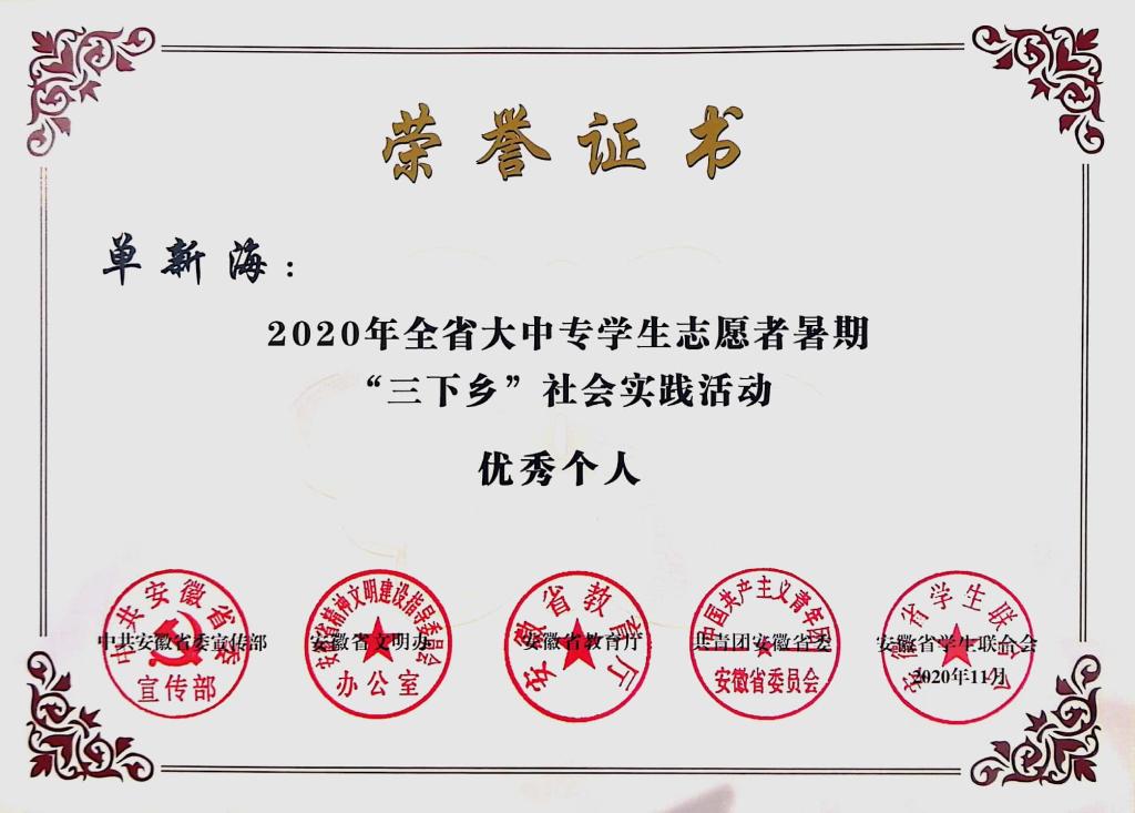 单新海注重大学生道德榜样的树立,用身边事教育身边人,充分发挥榜样的力量,自新冠肺炎疫情发生以来,积极响应学校号召,挺身而出,在全国疫情防控大形势下,单新海根据自身所在地区的特点进行2020年大学生创新创业项目的申报-《新冠疫情对合肥市农村地区基层治理的挑战与应对研究》,获国家级大创项目立项。其内容是通过调查合肥市地区乡村基层治理现状,归纳、实证分析新冠疫情对合肥市农村地区治理的挑战。探讨国外典型国家农村治理问题的一系列经验和教训,总结先进典型,获取典型做法,并提出新冠疫情对合肥市农村地区基层治理挑战的应对策略。