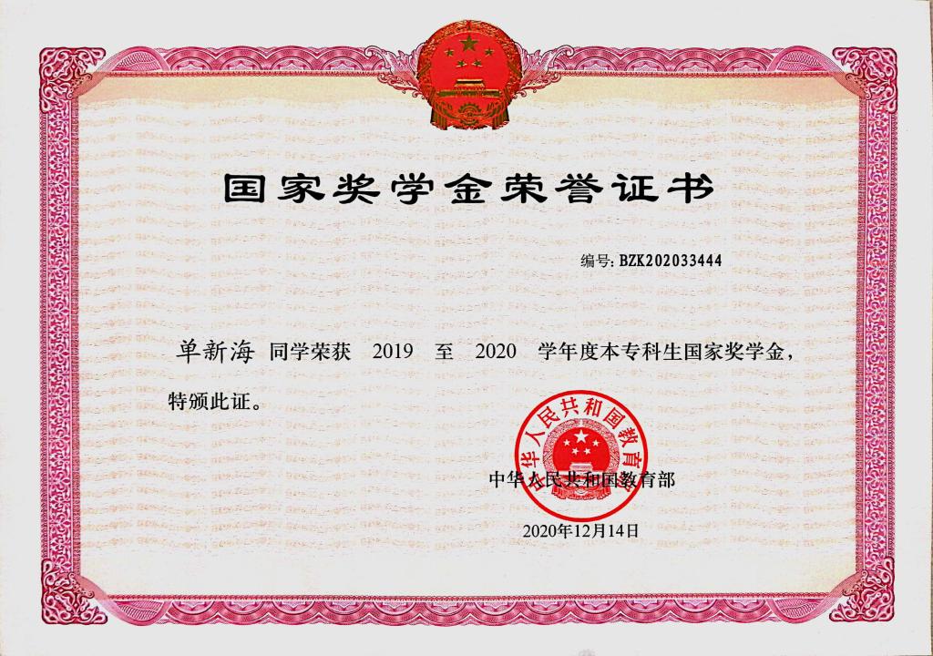 单新海父亲患有脑梗死、母亲腰间盘突出,腿部手术,家境贫寒加上自身心脏不好让他的求学之路比普通人更加艰辛,但是他仍不放弃学业,以乐观积极的态度面对挫折,克服重重困难,实现大学梦,大学入学至今,单新海连续两年获得专业双第一以及校一等优秀学生奖学金,校三好学生等荣誉,更是于2019年获得国家励志奖学金,2020年获得国家奖学金,为身边同学树立了模范作用。