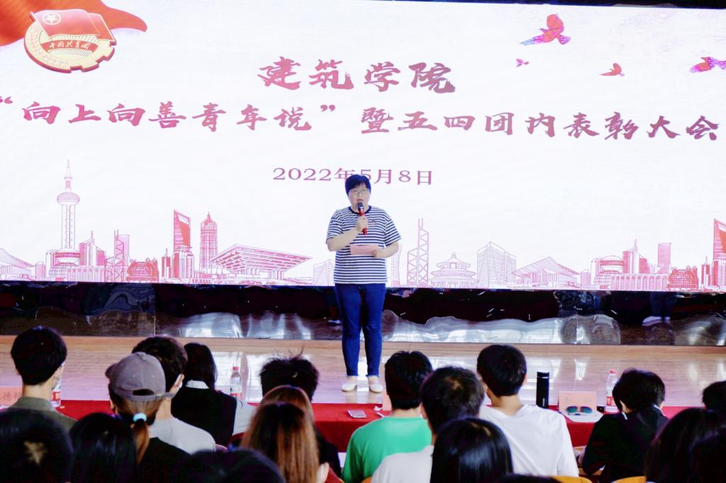 为庆祝中国共青团成立100周年,引导广大青年以榜样为标杆,弘扬五四精神,5月8日,建筑学院在敏行楼A报告厅举行“向上向善青年说”暨五四团内表彰大会。建筑学院党委副书记谢宜勤,团委书记沈德艳,辅导员李新,组织员吴婷婷,团委副书记武辉,入团十年以上团员,新型团支部书记,非毕业班班长、团支部书记,新发展团员以及2022年校级五四表彰获得者参加本次活动。