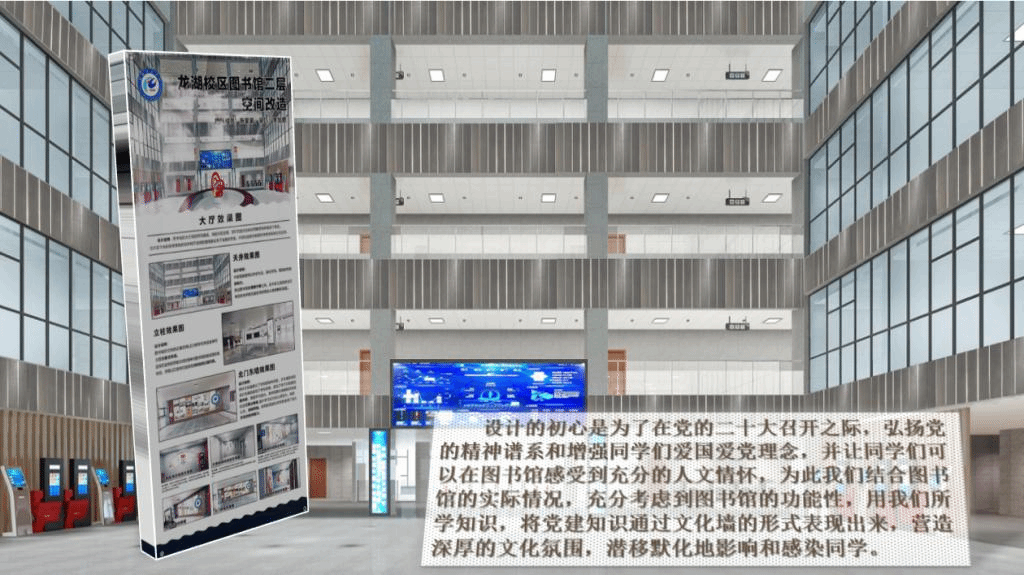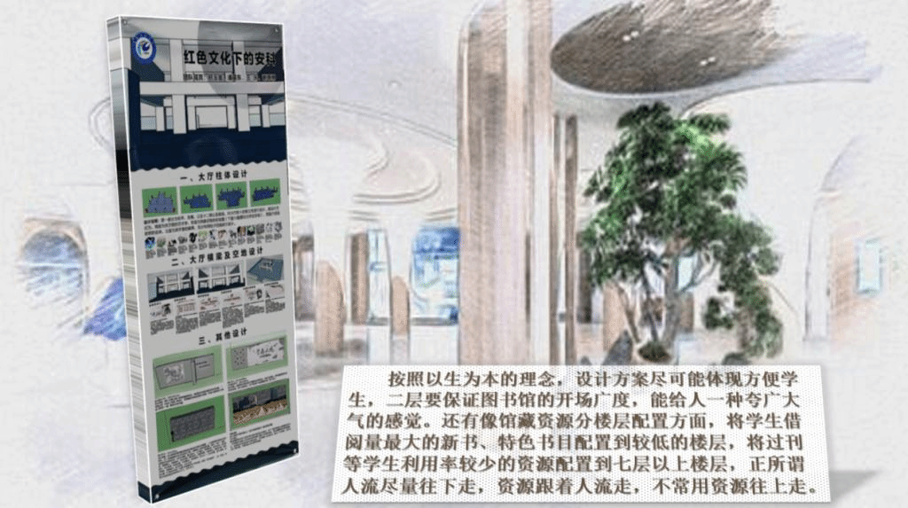 作品展示现场,获奖作品团队队长化身“讲解员”为前来参观的师生讲解了作品设计理念及创新点。一等奖团队队长张家豪说道:“我们团队的设计初心是喜迎党的二十大召开之际,弘扬党的精神谱系和增强同学们爱国爱党理念,让同学们感受到图书馆的家国情怀,并结合图书馆的实际情况,充分考虑到图书馆设计的美感和功能性,用我们所学知识,将党建知识通过文化墙的形式表现出来,营造深厚的文化氛围,潜移默化地影响和感染着同学。”