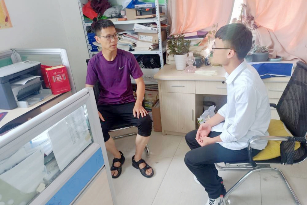 到达校园后,王健伟团队拜访了高三班主任崔猛老师和高中生物老师王乐潇。王健伟向老师说明了此次实践的主要目的和内容,介绍了三亿网页版的相关情况。在了解团队此行目的之后,崔老师、王老师非常热情地组织了部分高三返校生开展学习交流。