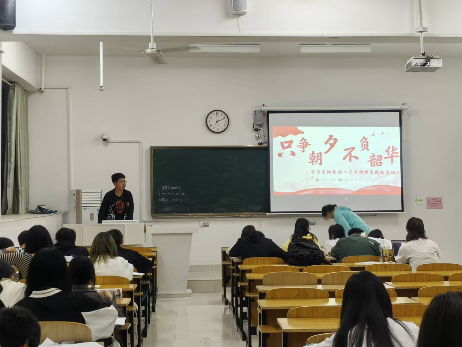 主题教育现场,各班级通过PPT展示,带领班级同学阅读党的二十大报告上作出的重要部署深入学习了党的二十大的主题、重要成果和重大意义。同时紧紧围绕“三个务必”,“六个坚持原则”等帮助同学们更加深刻了解领悟到党的二十大精神,明确认识到新时代新征程中国共产党的使命任务,更好去理解感悟中国式现代化在全面推进中华民族伟大复兴与新时代发展中的勃勃生机,指明了同学们要以党的二十大精神为指引,努力学习科学文化知识,提高自身综合素质,为实现中华民族伟大复兴的中国梦贡献自己的力量的前进方向。