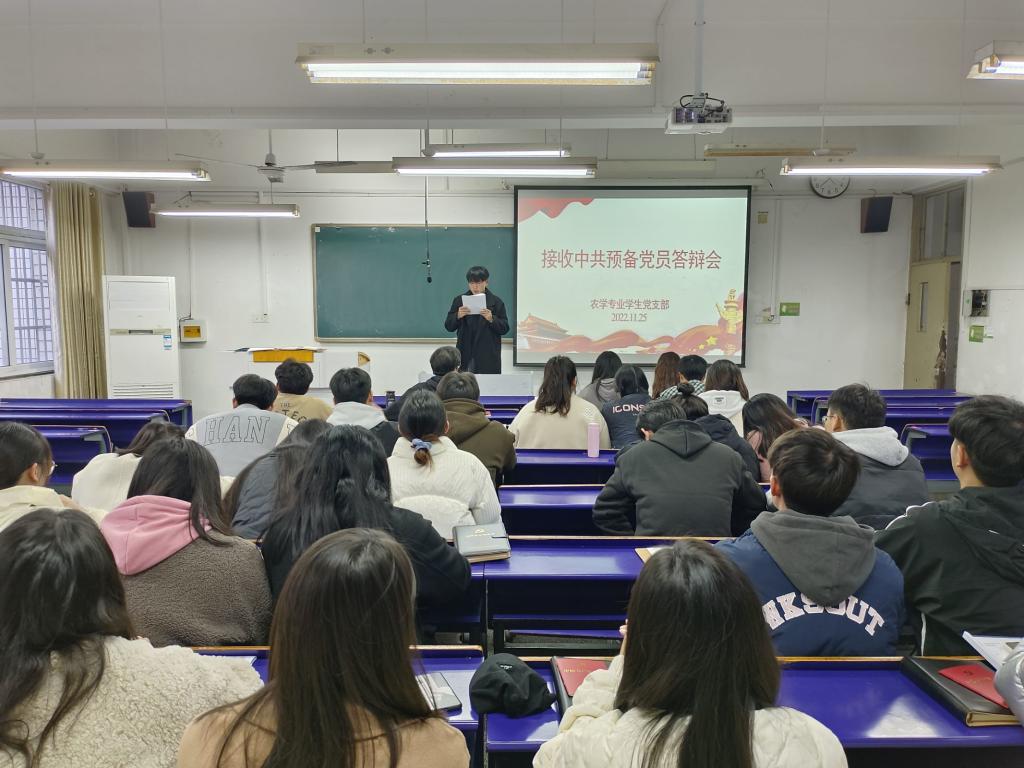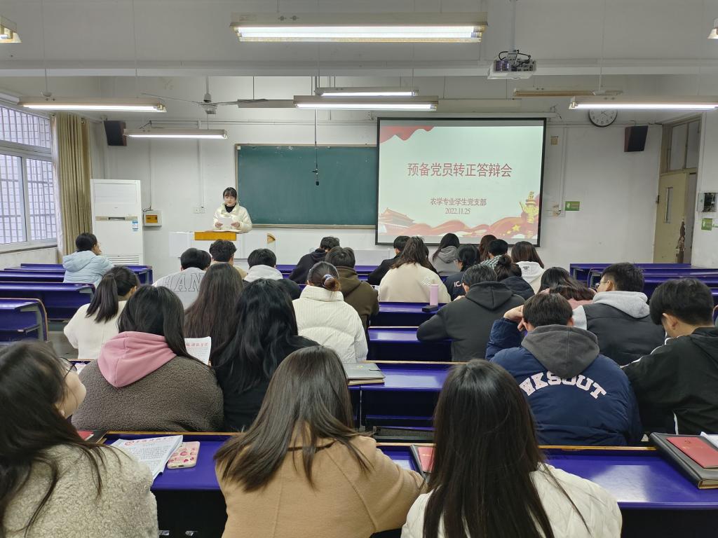 11月25日下午,农学专业学生党支部在求知楼B201召开接收预备党员暨预备党员转正大会。党支部全体党员参加会议,会议由党支部书记薛晶晶主持。