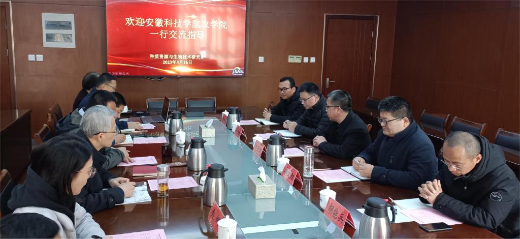 3月16日,农学院党委书记何世潮携安徽省饲草、玉米和蔬菜种质资源库负责人等一行6人赴江苏省农业科学院种质资源与生物技术研究所调研交流。种质资源所所长赵涵、支部书记李胜、种质资源所种质资源保护团队、玉米种质资源创新团队、种质资源DNA分子指纹库和综合基因负责人参加交流,交流座谈会由赵涵主持。