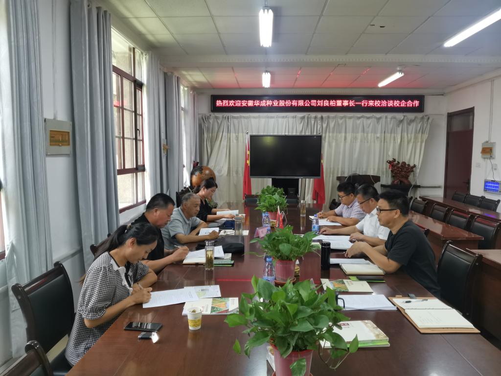 粮安天下,种铸基石,种子是农业芯片。为更好地培养国家紧缺应用型种业人才,充分发挥校企联合办学优势,8月9日上午,安徽华成种业股份有限公司党支部书记、董事长刘良柏,董事会秘书、人力资源部部长王晶晶,党政办主任、支部委员韩欢等一行4人来农学院洽谈“华成种子班”筹办事宜。农学院党委书记何世潮,副院长舒英杰、李文阳,专职辅导员汪道兵参加交流洽谈。