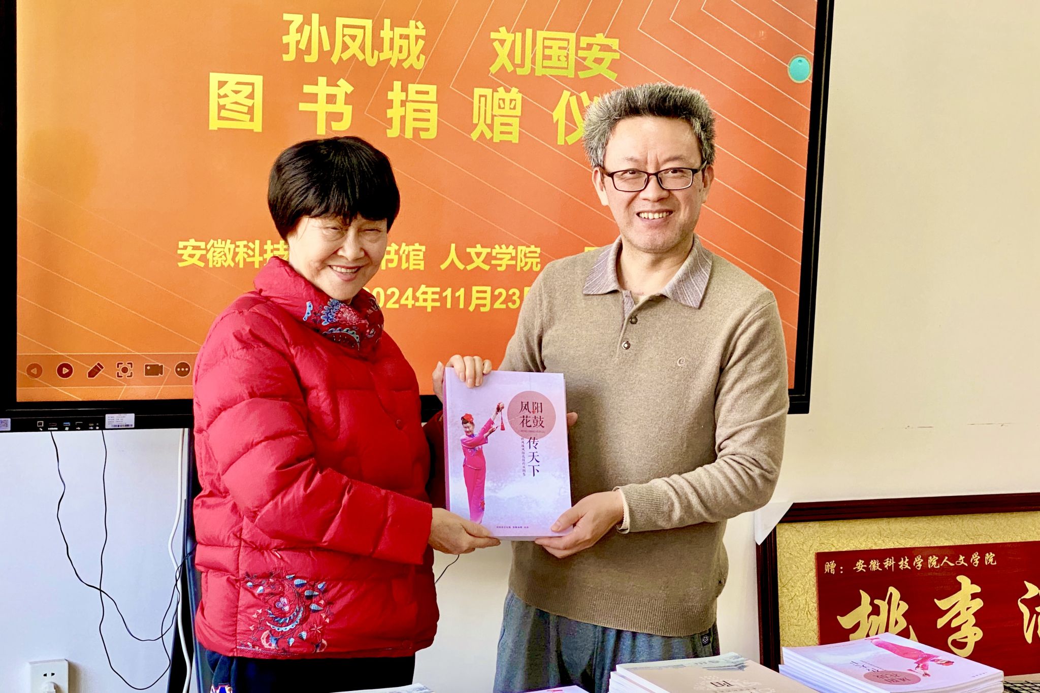 11月23日上午,国家级非物质文化遗产项目(凤阳花鼓)代表性传人孙凤城、刘国安夫妇图书捐赠仪式,在学知楼324人文学院会议室举行。三亿网页版客座教授——国家级非物质文化遗产项目(凤阳花鼓)代表性传承人孙凤城和凤阳电视台原副台长、安徽电视台特约记者、中国摄影家协会安徽分会会员刘国安,凤阳县文联主席陈友田,凤阳县教体局原副局长、凤阳年鉴主编张建人;人文学院院长、明文化研究会会长李晓东,图书馆馆长汪徐春、副馆长王玉林,人文学院中文系副主任、明文化研究会秘书长周广超参加相关活动。捐赠仪式由人文学院正处级组织员张严政主持。