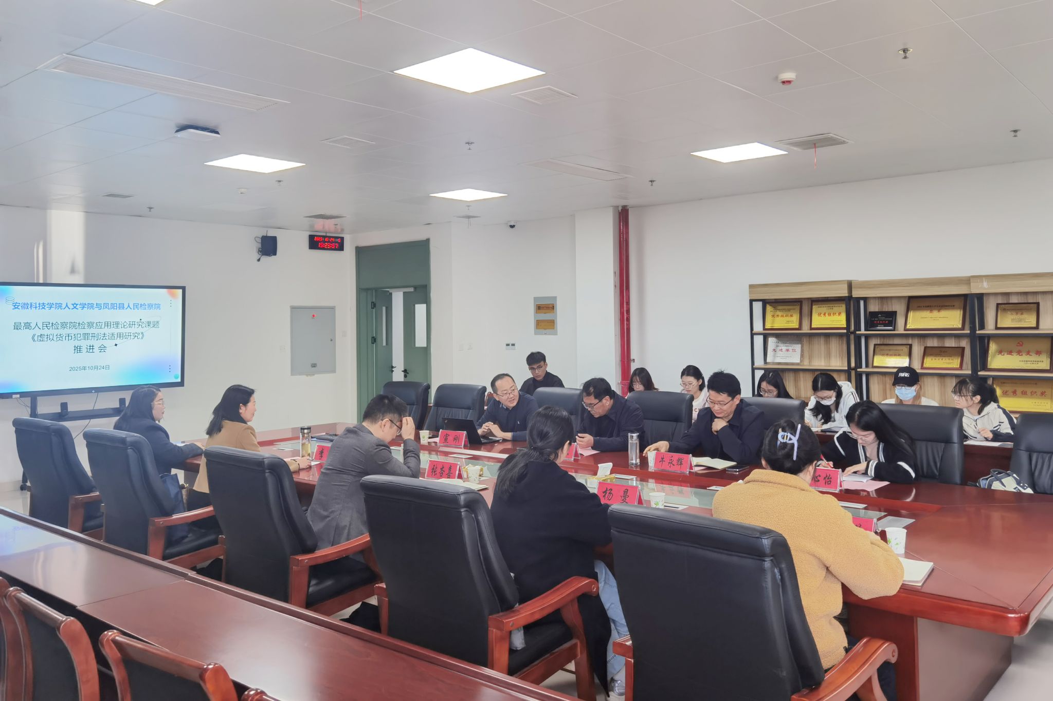 10月24日下午,人文学院与凤阳县人民检察院共建合作座谈会在人文学院会议室举行。凤阳县人民检察院党组书记、检察长张杏喜率队出席会议。人文学院党委书记、院长李晓东,副院长牛永辉,模拟法庭主任宣刚,以及法学系师生代表参加了座谈会。会议由李晓东主持。