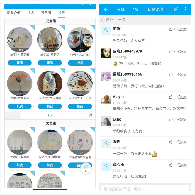 本次活动分为线上打卡投票和线下签名承诺两个部分,面向全校师生,发出节约粮食、节约用水、节约用电等倡议。线上活动通过易班APP展开,分为诗词画作展示、“光盘承诺”留言点赞两个环节。广大学生积极参与,有50余名学生围绕“节约粮食”主题提交了原创作品,同学们在活动页面踊跃参与留言、点赞、评论。