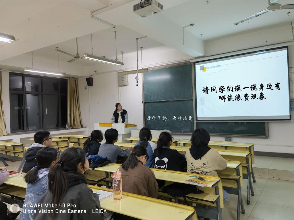 鲁冰冰首先介绍了习近平总书记的重要指示,要求大学生站在维护国家粮食安全、弘扬良好社会风尚的高度,认识到餐饮浪费行为的严重危害,同时明确提出坚决制止餐饮浪费行为的具体举措。然后各班级通过PPT和相关视频资料,向学生们展示当下人们在日常生活中的浪费情况,以此来宣传勤俭节约的美德,并且呼吁大家以身示范带动更多人践行勤俭节约新风尚,推动社会风气进一步好转。汉语言文学专业班助刘啸表示,“直面当下,光荣的历史使命、伟大的奋斗目标、复杂的内外环境,都呼唤我们要懂得保持艰苦朴素、勤俭节约的作风。弘扬中华民族传统美德,是每个人义不容辞的责任。”