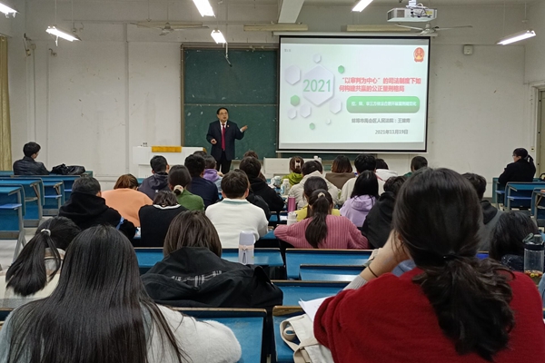 王瑞青首先向学生讲述了一些自己的工作经历,随后围绕量刑规范化的背景,影响量刑的相关情节,规范量刑的基本方法三个方面向大家详细地展开演讲,并表示量刑规范化改革是新时代法制中国建设的需要,顺应了世界量刑改革的浪潮。最后,王瑞青鼓励法学专业学生们,作为当代法律人要养成“终身学习,终身进步”的品质,为中国的法治建设贡献出自己的一份力量。