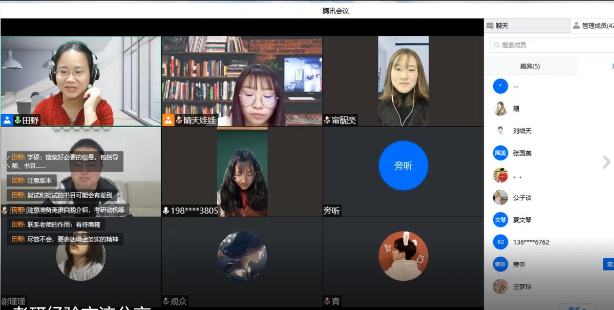 会上范雨梦老师针对调剂形势、调剂程序、调剂学校、调剂系统填报技巧和调剂系统注意事项等做了全面系统的讲解。方明旺老师以及学院2020届、2021届部分优秀考研毕业生们结合自己研究生的复试经历,从选导师、面试准备、口语能力、面试流程、注意事项方面进行了分享交流。针对学生们在复试过程中可能遇到的问题及困难,他们还结合自身复试经历做了详尽解答。