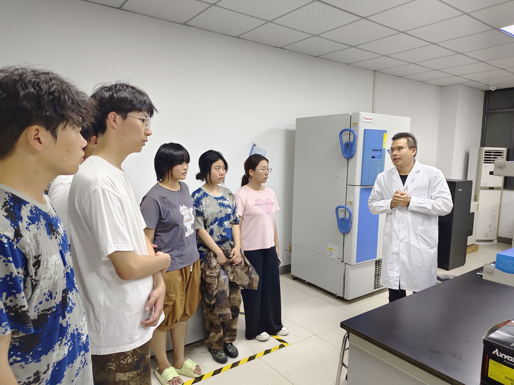 学院2024级新生按照专业分批跟随邱万伟,江琦老师参观生物医药与健康研究院。两位老师向新生介绍了研究院的由来和研究院各层主要功能,并详细介绍了展柜中的各类生物产品,如新冠病毒检测试纸、铁皮石斛、香皂、口红等。还向同学们介绍了原子吸收光谱仪、高分辨透射电子显微镜等大型仪器,并参观了扫描电子显微镜室。在生物传感实验室为新生演示新冠病毒检测试纸,并讲述该实验室的主要功能,在色谱实验室和光谱实验室,他们详细地为新生介绍实验室中的各类器材。参观期间,新生们积极地提出自己的疑问,两位老师耐心地一一为新生答疑解惑。