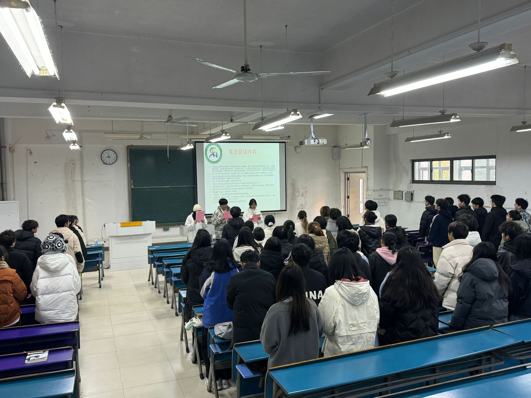 在学知楼417会议室,学院部分领导、辅导员及学生代表一起学习了“宪法晨读”文本,观看了“宪法晨读”活动直播视频。在新知楼B103教室,学院正科级辅导员、正科级组织员、法治工作联系人邓艳萍为2024级部分学生骨干详解了“宪法是什么?宪法的地位如何?宪法规定了哪些内容?现行宪法是新中国成立以后第几部宪法?以及宪法与我们每个人生活息息相关”等内容。在“五四广场”举办了以“大力弘扬宪法精神,推动进一步全面深化改革 ”为主题的线下签名活动。在易班平台,开设了线上“法治与安全教育”主题课群和“学习宪法知识”系列推文。在2024级新生中,遴选13名同学组成合唱团,唱响了《宪法伴我们成长》歌曲。