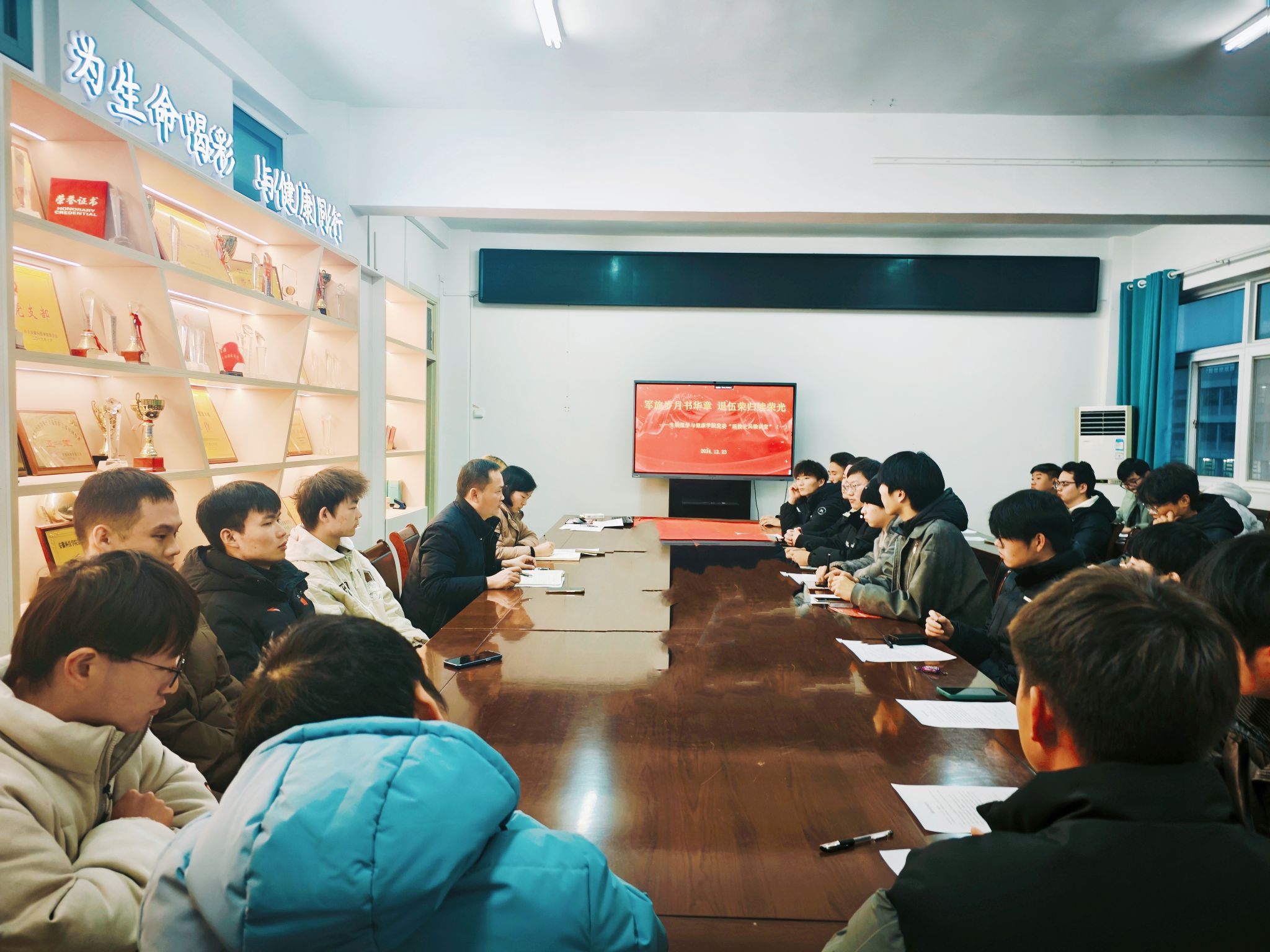 为进一步营造参军光荣的浓厚校园氛围,充分激发广大青年学子尤其是毕业生参军报国热情,12月23日下午,生物医学与健康学院党委在学知楼417会议室举办第一期“退役士兵微讲堂”。学院党委书记张传德,党委副书记、纪委书记彭丽萍,正科级辅导员、正科级组织员、征兵工作联络人及2025年春季应征入伍报名学生参加微讲堂。学院5位退役大学生应邀出席。微讲堂由彭丽萍主持。