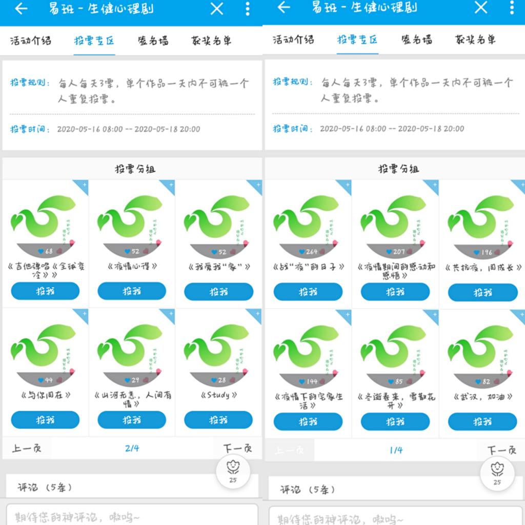 比赛自开展以来同学们都积极参加,征集作品形式各异,各参赛作品围绕着“疫情易心助力心健”主题进行表演。作品内容展现着疫情期间当代大学生临危不惧,积极向上的精神风貌。本次比赛在易班公共平台开启线上投票渠道,最终经过易班投票和评委打分,来自生命科学卓越171班周唐唐的作品《战“疫”的日子》和生物技术172班陈颜的作品《疫情期间的感动与感悟》以其贴近生活和触动心灵的语言,斩获一等奖,其他同学分别获得二、三等奖及优秀奖。