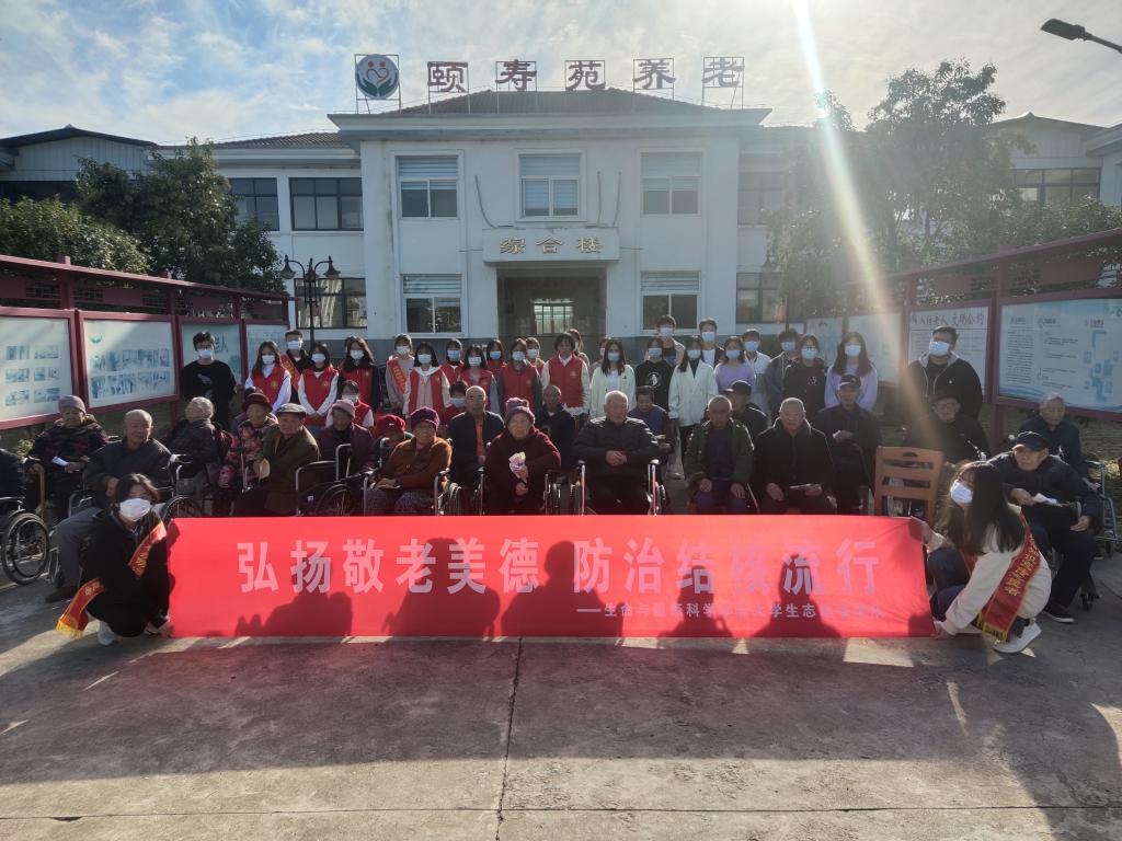 活动期间,学生志愿者们面带灿烂的笑容,满怀真挚的问候前去看望老人,帮助老人整理房间、打扫院落,并给老人们带去了相声、吉他弹唱、舞蹈等精彩节目。表演结束后,学生们与老人手牵手漫步、心贴心交流,细致地了解老人们在敬老院的生活状况和身体状况,提醒他们要注意节气变化,适时添加衣物,保重身体,健康长寿。同时,为有效保护老年人身体健康,学生志愿者们通过悬挂横幅、宣讲资料等的方式向老人们宣传结核病防治知识。同学们与老人面对面、一对一交谈,耐心且细致地讲解了结核病的基本概念、常见症状及防治知识,并介绍了预防结核病的简单方法和发现结核病的应急处理。活动最后,老人们与学生志愿者合影留念,感谢他们带来的欢乐时光。来自中药学专业203班的郭院婷在活动结束后发表了自己的感想:“与这群慈祥和蔼的老人们交谈,我感受到了如家人般的温暖很亲切。希望他们都健康长寿,阖家幸福,也祝天下所有的老人身体康健,平安幸福。”