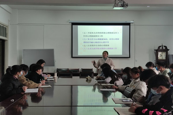彭丽萍从社会竞争激烈、学习和生活压力大、身心发展不够成熟三个方面向同学们讲述了开展大学生心理健康教育工作的意义。围绕心理委员应具备的能力和素质,心理委员的工作职责,大学生常见的心理困惑,产生大学生心理困惑原因分析,心理委员如何有效开展“朋辈”心理健康辅导工作展开讲解。为引导同学们重视心理健康教育工作,她着重强调心理委员的重要性并对心理委员提出了以下五点要求:一是加强学习,学习心理健康知识,不断提升心理素质和工作能力;二是学会倾听,要善于引导学生自我教育、自我管理;三是学会共情,换位思考;四是不把自己的价值观念强加与别人,发挥“朋辈”辅导功能;五是要与时俱进,不断创新工作方法。同时,她希望同学们要做一个身心协调发展,内心强大,积极进取,韧性十足的人。最后,彭丽萍介绍了我校心理健康工作四级网络结构,再一次强调了我校对大学生心理健康教育工作的重视。