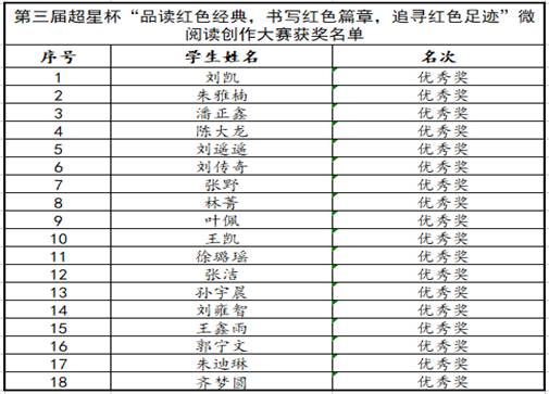 由安徽省高等学校图书情报工作委员会和安徽省高等学校数字图书馆主办、安徽超星信息技术有限公司协办的第三届超星杯“品读红色经典,书写红色篇章,追寻红色足迹”微阅读创作大赛活动之一“阅读红色经典,拿阅读学分”,经过三个月的激烈竞争,于6月1日结束统计,大赛取全省积分前三百名予以奖励。我校学子在本项活动中踊跃参与,其中刘凯等18位同学荣获优秀奖。