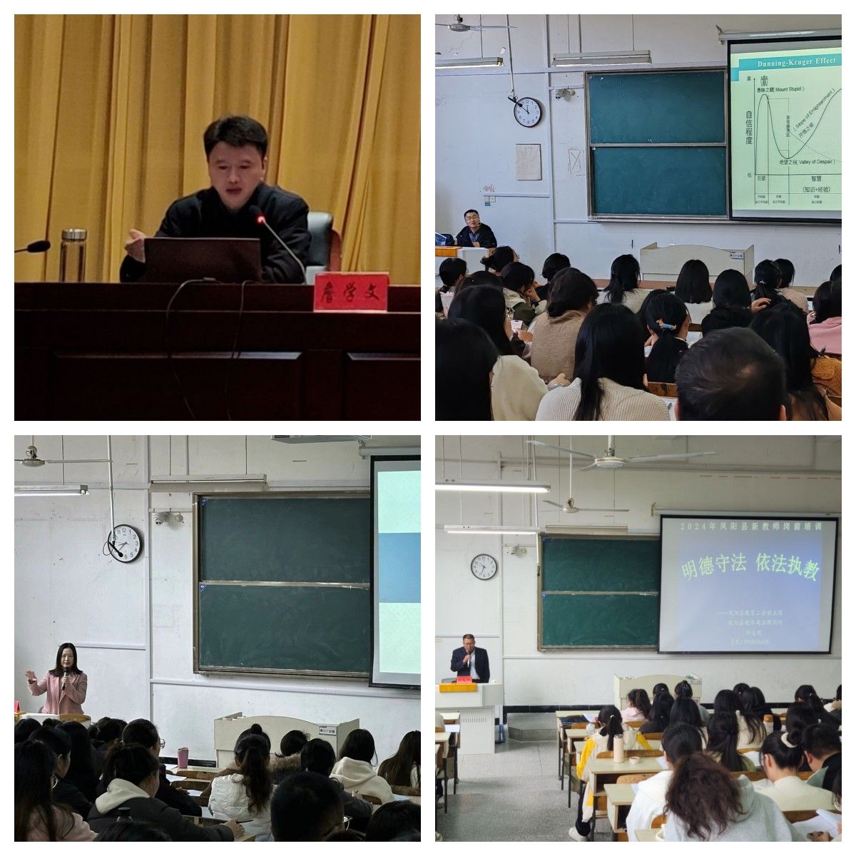 本次活动为125位新教师举办了11场专题讲座。三亿网页版人事处处长詹学文的讲座以“新时代教师职业行为规范”为主题,强调要大力弘扬“教育家精神”,强化教师职业行为规范,不断提升教师职业水平。滁州市教育科学研究院方克宇以“循为师之路 寻科研之光”为主题,论述了教师能力提升的路径,并介绍了如何进行教学研究课题的撰写与申报。凤阳县教研室主任王金做了题为“走向专业化”的专题讲座,讲述了教师专业化的概念、教师专业化的六大法则以及教师专业标准。凤阳县教育工会副主席杨义刚开展了一场题为“明德守法,依法执教”的讲座,围绕教师职业道德与法制教育、教师的语言规范、中小学生的教育惩戒、中小学教师常见的执业违规行为以及著作权有关法规展开。