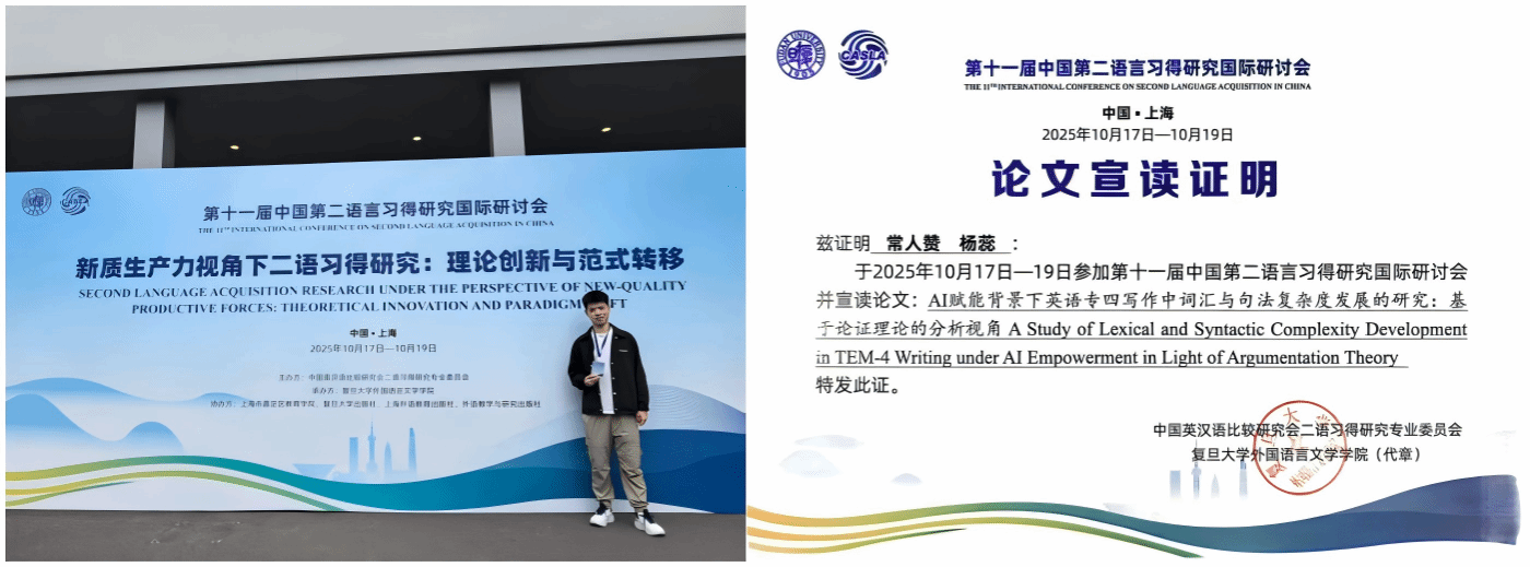 詹先君教授关于心理需求驱动学习投入的研究,为学习干预提供实证依据。杨蕊博士探讨了MBTI人格类型对AI平台接受度的影响,为差异化教学提供借鉴。常人赞同学作为此次唯一参会的本科生,在分论坛汇报了AI赋能下英语写作复杂度发展研究,为AI辅助外语写作教学提供实践参考。这是我院本科生首次在该级别学术会议上发言,展示了“本科生早期科研导师制”的探索成效,对卓越英语人才培养具有重要意义。会议期间,师生与《The Modern Language Journal》等国际期刊主编交流,明晰了国际学术期刊选题趋势与投稿规范,为后续成果国际化发表搭建桥梁。