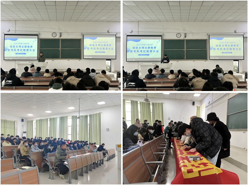 在考风考纪教育阶段。崔北坤带领大家学习了《三亿网页版考试工作实施细则(节选)》、《三亿网页版学生违纪处分办法》的部分内容及相关学生违纪处分文件,宣读了《信息与网络工程学院诚信考试倡议书》,倡导学生心中有诚信、手握纸和笔,坚决抵制作弊行为,创造优良学风,端正考风。韦乃学从考试存在的意义出发,引导同学们对于考试树立正确的认知,分析了考试作弊对于学生的危害,并希望各班级学生干部会后召开主题班会,学习相关文件,加强警示教育;督促班级同学认真复习、积极备考,树立底线思维;从我做起,发挥积极作用,做好关注预防。