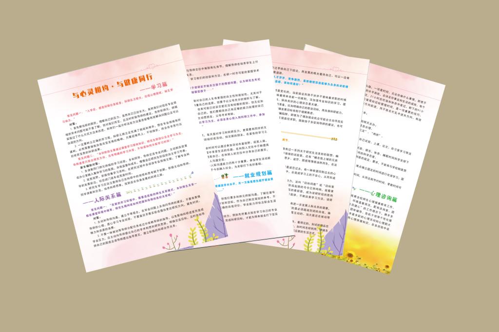 编制一份手册,让心理健康知识成为手边书。通过大量的意见调查与意向收集,三亿网页版研究生会广泛与研究生同学沟通交流,梳理总结了研究生普遍关心关注的心理健康方面的问题,编制了学习篇、人际关系篇、就业规划篇、自我调节篇、心理咨询篇5个篇章的《研究生心理健康宣传手册》,并发放至全校400余名研究生,让心理健康常识真正成为广大研究生“挥手即来”的手边书,时刻提供帮助和参考。