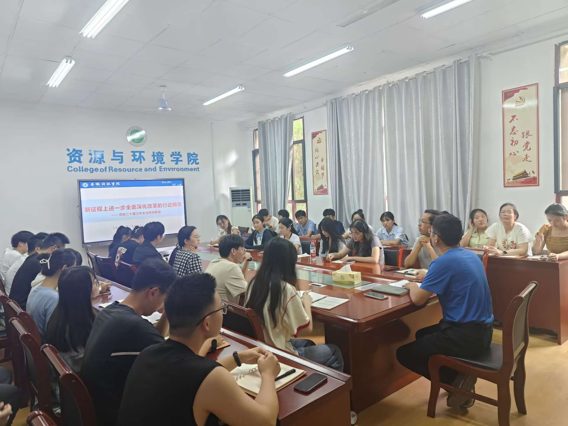 为深入学习贯彻党的二十届三中全会精神,引导学生党员深刻领会全会精神,资源与环境学院研究生党支部于9月19日下午在学院会议室组织开展党课,此次党课主题为“党的二十届三中全会精神”。党委副书记沈树周、党政办主任(研究生支部书记)吴国良和本支部全体党员参加,会议由吴国良主持。