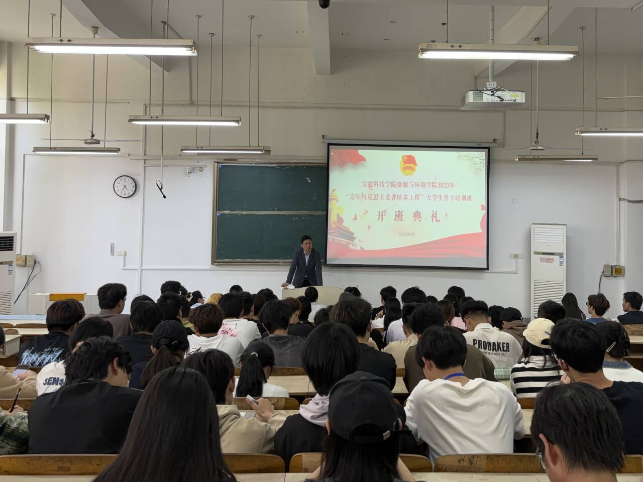 为深入学习贯彻习近平新时代中国特色社会主义思想和党的二十大精神,夯实大学生骨干思想根基,4月23日下午,资源与环境学院于求知楼A102教室举办2025年“青年马克思主义者培养工程”大学生骨干培训班开班典礼。学院党委书记沈树周出席并讲授第一讲,全体辅导员、团委委员、学生会成员、24级班委参加典礼,典礼由团委书记杨小晗主持。