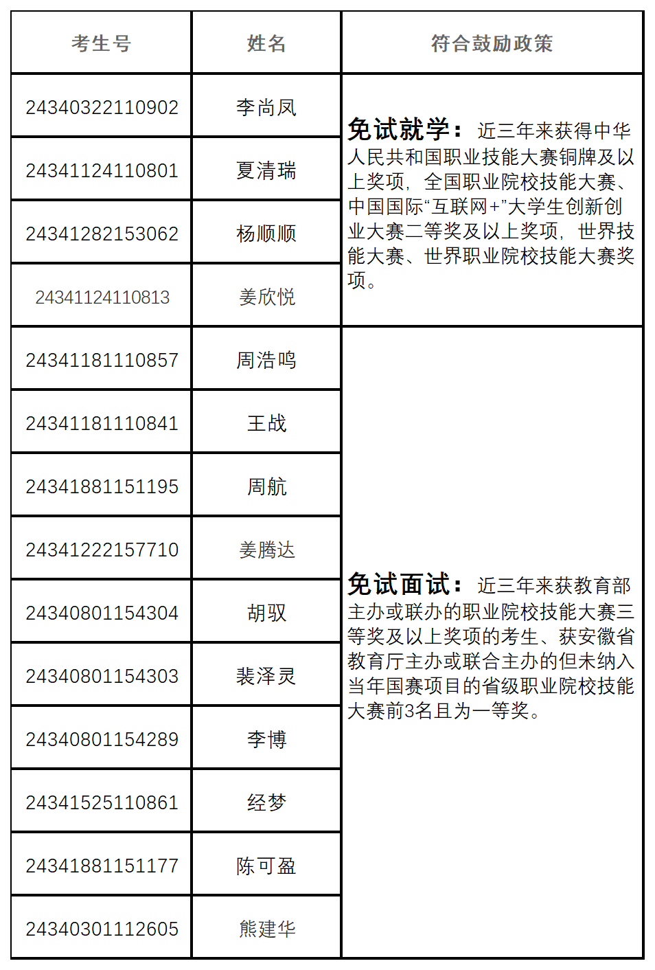 根据《三亿网页版2024年面向中职毕业生对口招生章程》关于申请免试就学、免试面试和加分鼓励政策的相关要求,经考生申请,学校审核,共有李尚凤等4名考生符合免试就学政策,周浩鸣等10名考生符合技能大赛免试面试政策,无符合考试加分政策考生,现对符合相关鼓励政策的考生信息予以公布。免试就学资格复审和免试面试具体安排见通知公告栏“三亿网页版2024年对口招生考试免试就学资格复审和免试面试工作通知”。如有异议或遗漏,请于4月3日17:00前联系三亿网页版招生办公室:0550-6732041,0552-3197041。