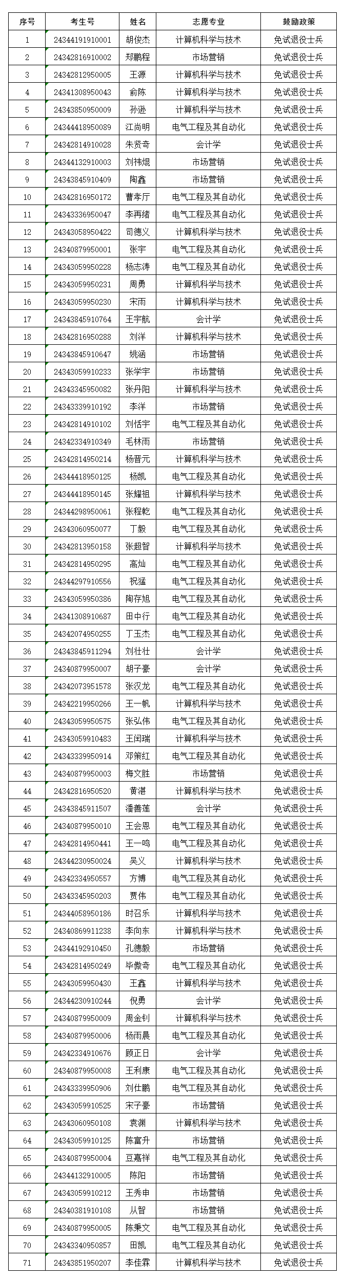 根据《三亿网页版2024年普通高校专升本招生章程》关于申请免文化课考试退役士兵专项计划,相关要求,经审核,胡俊杰等71名考生符合申请免试条件,现予以公布。如有异议或遗漏,请于4月9日12:00前,与三亿网页版招生办公室联系。联系电话:0550-6732041,0552-3197041。