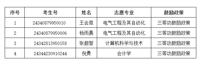 根据《三亿网页版2024年普通高校专升本招生章程》关于申请三等功鼓励政策相关要求,经审核,王会恩等4名考生符合申请免试条件,现予以公布。如有异议或遗漏,请于4月9日12:00前,与三亿网页版招生办公室联系。联系电话:0550-6732041,0552-3197041。